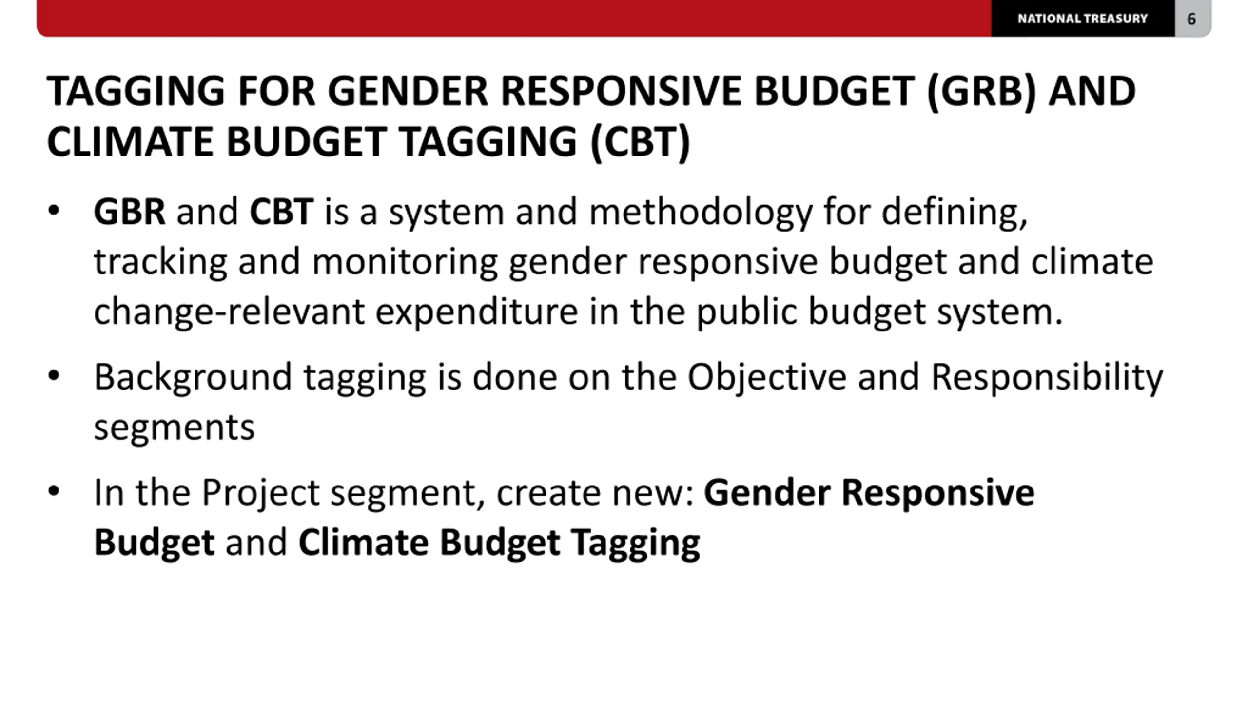 6 TAGGING FOR GENDER RESPONSIVE BUDGET (GRB) AND CLIMATE BUDGET TAGGING (CBT) GBR and CBT is a system and methodology for defining, tracking and monitoring gender responsive budget and climate change-relevant expenditure in the public budget system. Background tagging is done on the Objective and Responsibility segments In the Project segment, create new: Gender Responsive Budget and Climate Budget Tagging