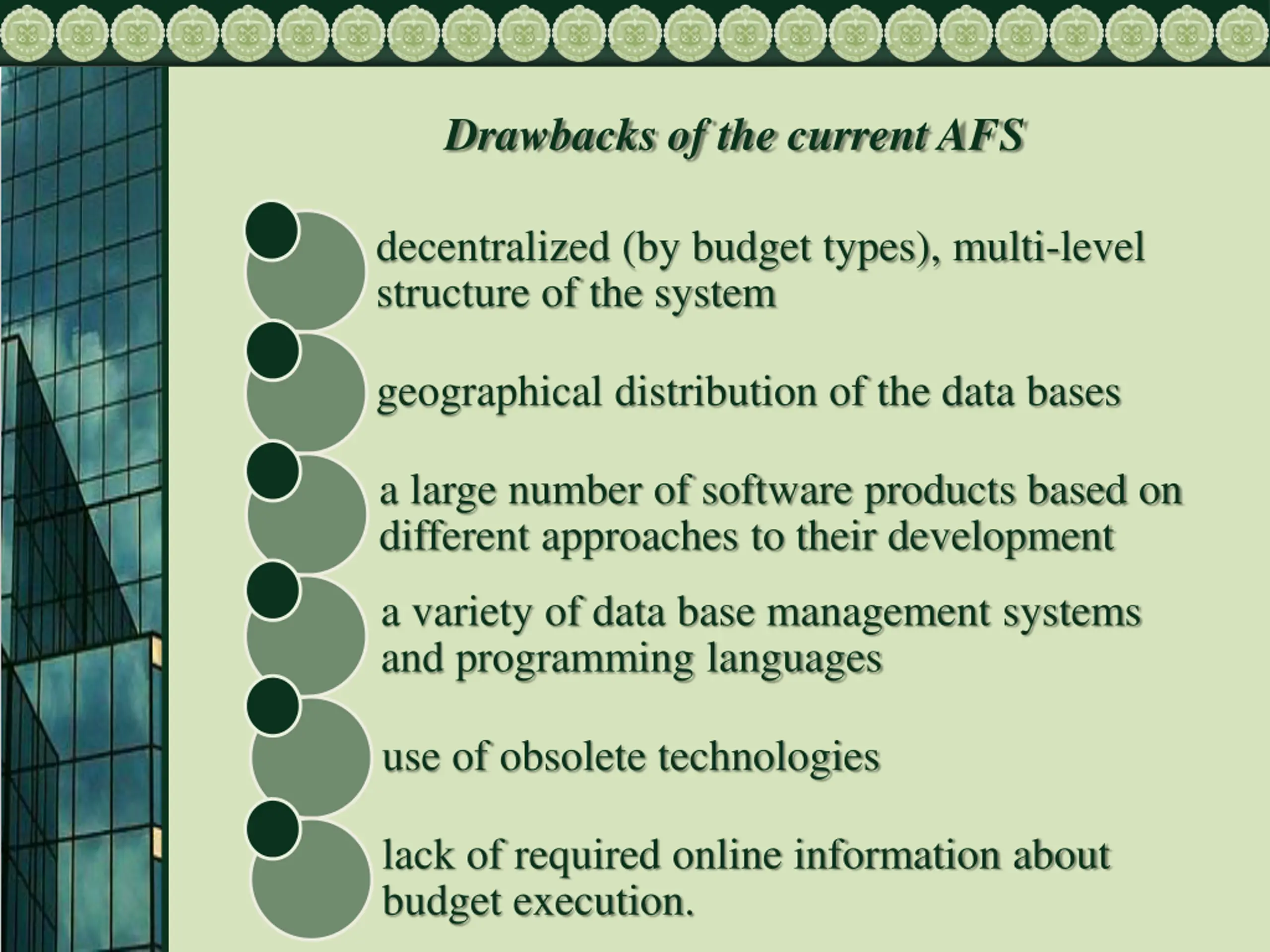 Drawbacks of the current AFS decentralized (by budget types), multi-level structure of the system geographical distribution of the data bases a large number of software products based on different approaches to their development a variety of data base management systems and programming languages use of obsolete technologies lack of required online information about budget execution.
