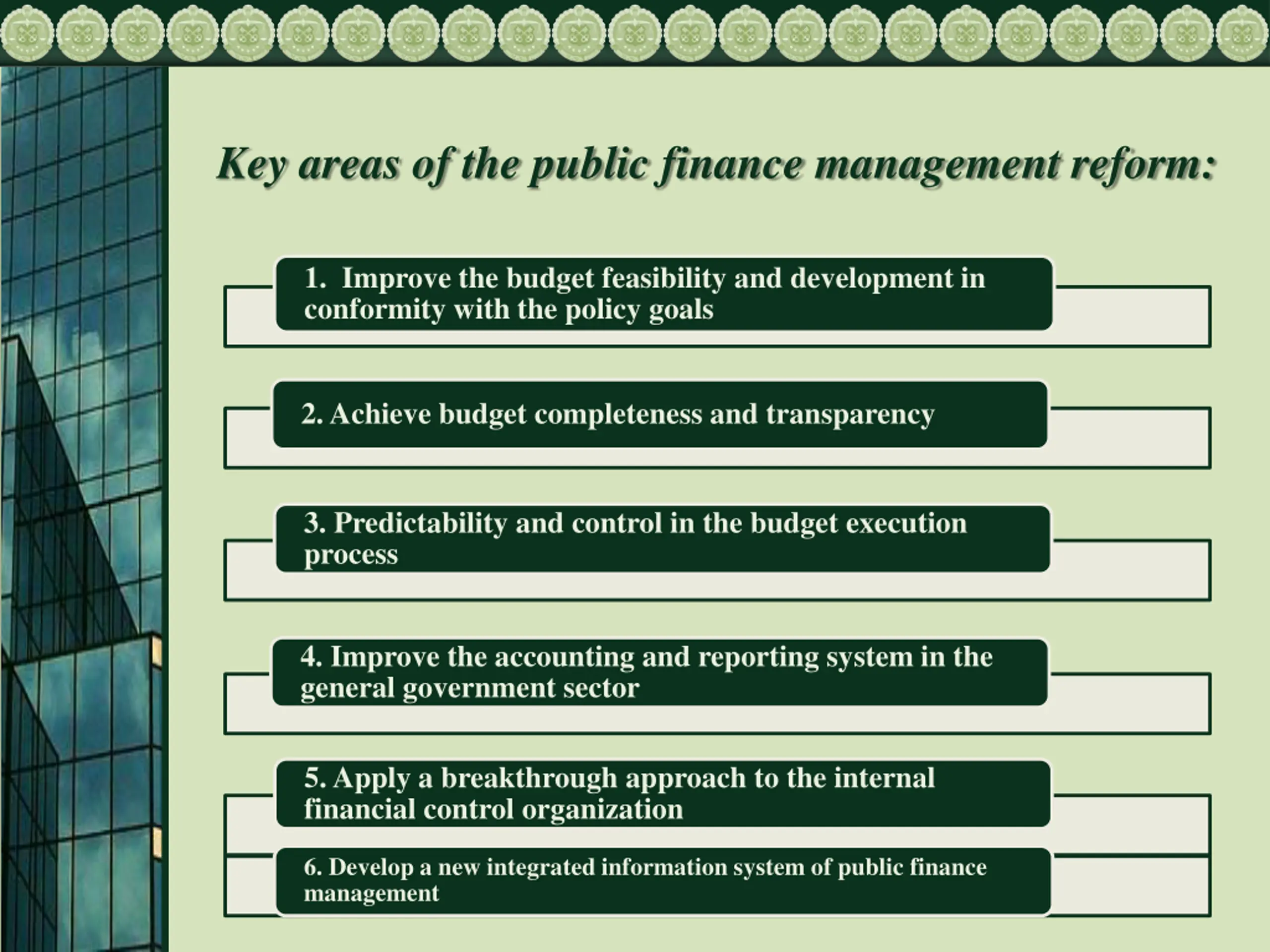 Key areas of the public finance management reform: 1. Improve the budget feasibility and development in conformity with the policy goals 2. Achieve budget completeness and transparency 3. Predictability and control in the budget execution process 4. Improve the accounting and reporting system in the general government sector 5. Apply a breakthrough approach to the internal financial control organization 6. Develop a new integrated information system of public finance management