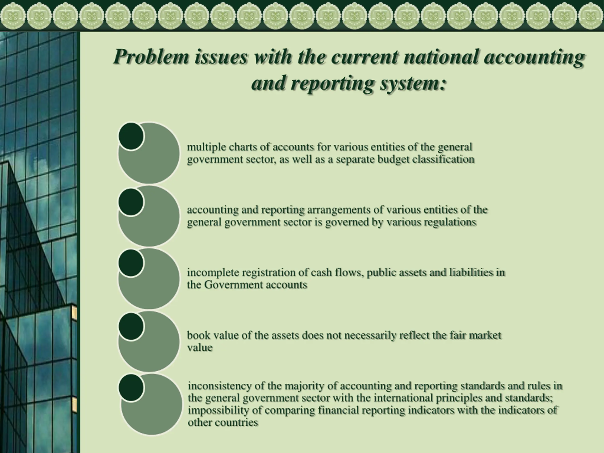 Problem issues with the current national accounting and reporting system: multiple charts of accounts for various entities of the general government sector, as well as a separate budget classification accounting and reporting arrangements of various entities of the general government sector is governed by various regulations incomplete registration of cash flows, public assets and liabilities in the Government accounts book value of the assets does not necessarily reflect the fair market value inconsistency of the majority of accounting and reporting standards and rules in the general government sector with the international principles and standards; impossibility of comparing financial reporting indicators with the indicators of other countries