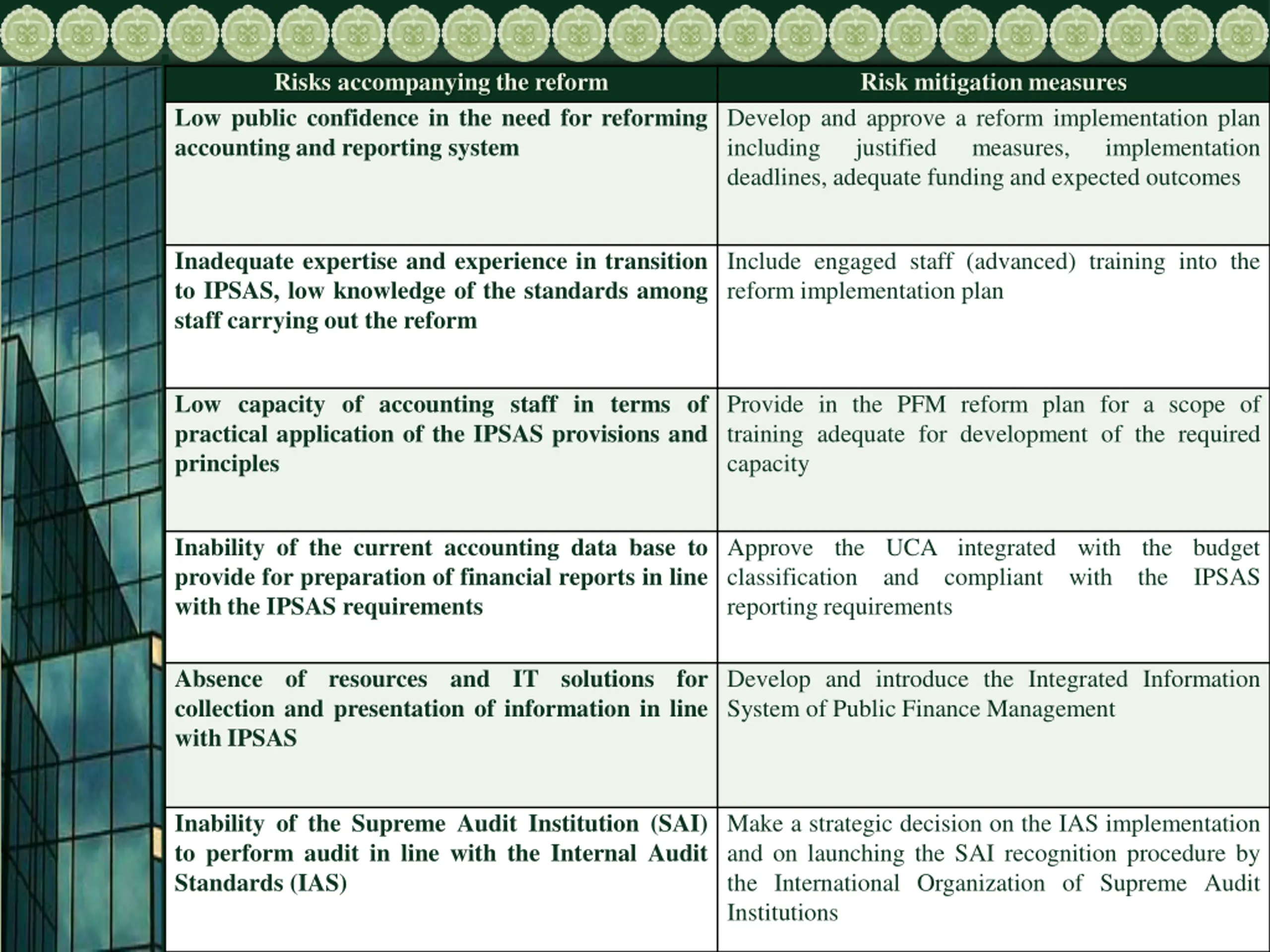 Risks accompanying the reform Low public confidence in the need for reforming accounting and reporting system Risk mitigation measures Develop and approve a reform implementation plan including justified measures, deadlines, adequate funding and expected outcomes implementation Inadequate expertise and experience in transition to IPSAS, low knowledge of the standards among staff carrying out the reform Include engaged staff (advanced) training into the reform implementation plan Low capacity of accounting staff in terms of practical application of the IPSAS provisions and principles Provide in the PFM reform plan for a scope of training adequate for development of the required capacity Inability of the current accounting data base to provide for preparation of financial reports in line with the IPSAS requirements Approve the UCA integrated with the budget classification and compliant reporting requirements with the IPSAS Absence collection and presentation of information in line with IPSAS of resources and IT solutions for Develop and introduce the Integrated Information System of Public Finance Management Inability of the Supreme Audit Institution (SAI) to perform audit in line with the Internal Audit Standards (IAS) Make a strategic decision on the IAS implementation and on launching the SAI recognition procedure by the International Organization of Supreme Audit Institutions