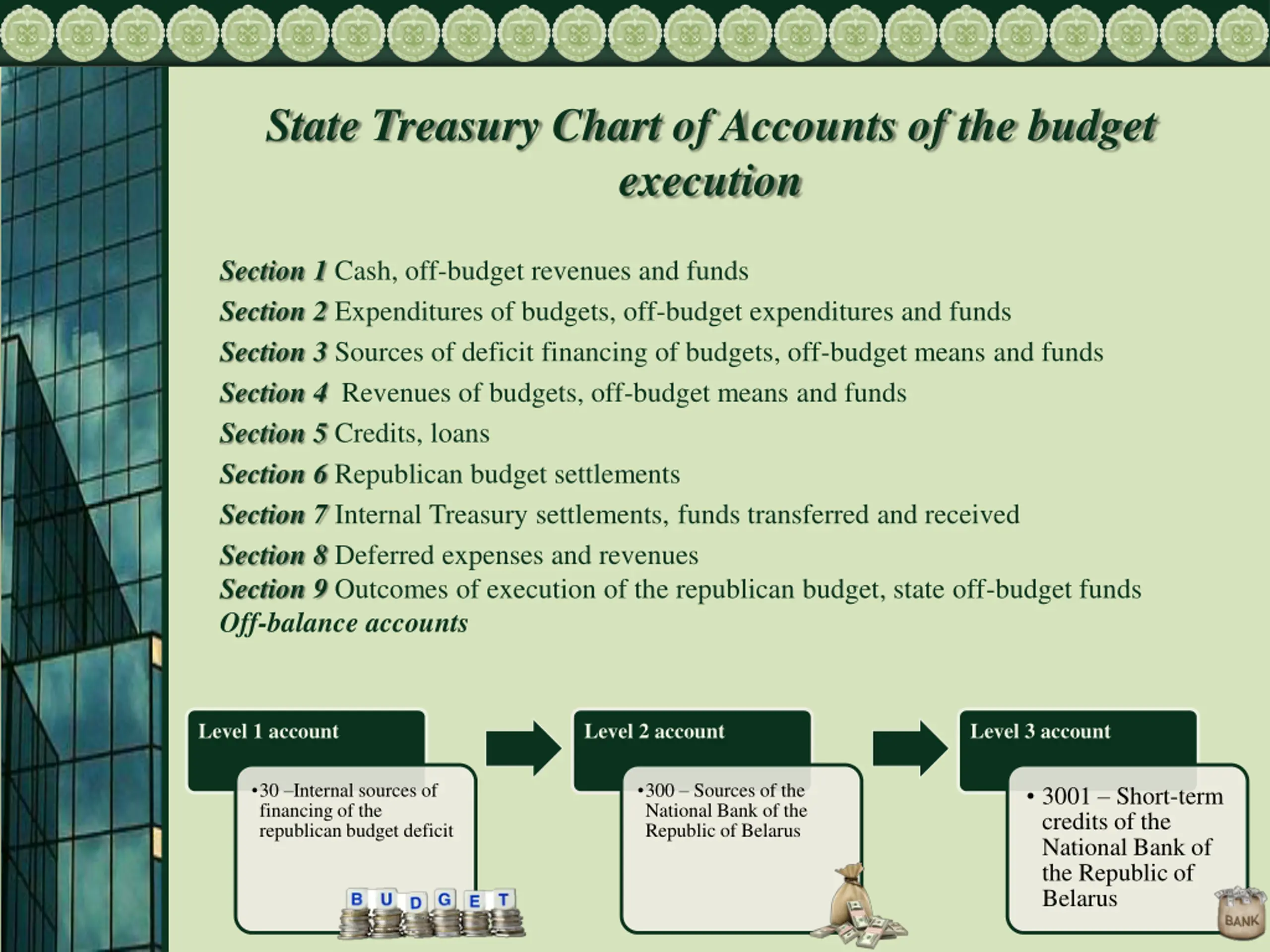 State Treasury Chart of Accounts of the budget execution Section 1 Cash, off-budget revenues and funds Section 2 Expenditures of budgets, off-budget expenditures and funds Section 3 Sources of deficit financing of budgets, off-budget means and funds Section 4 Revenues of budgets, off-budget means and funds Section 5 Credits, loans Section 6 Republican budget settlements Section 7 Internal Treasury settlements, funds transferred and received Section 8 Deferred expenses and revenues Section 9 Outcomes of execution of the republican budget, state off-budget funds Off-balance accounts Level 1 account Level 2 account Level 3 account 30 Internal sources of financing of the republican budget deficit 300 Sources of the National Bank of the Republic of Belarus 3001 Short-term credits of the National Bank of the Republic of Belarus