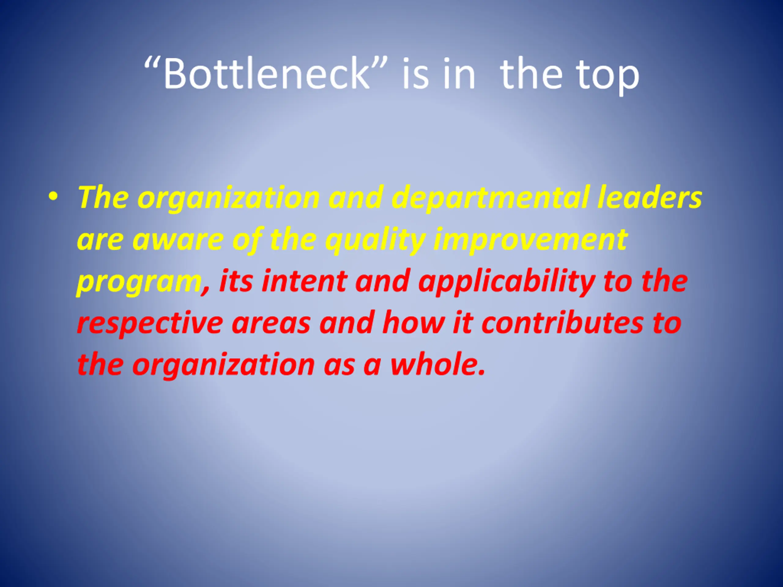 Bottleneck is in the top The organization and departmental leaders are aware of the quality improvement program, its intent and applicability to the respective areas and how it contributes to the organization as a whole.