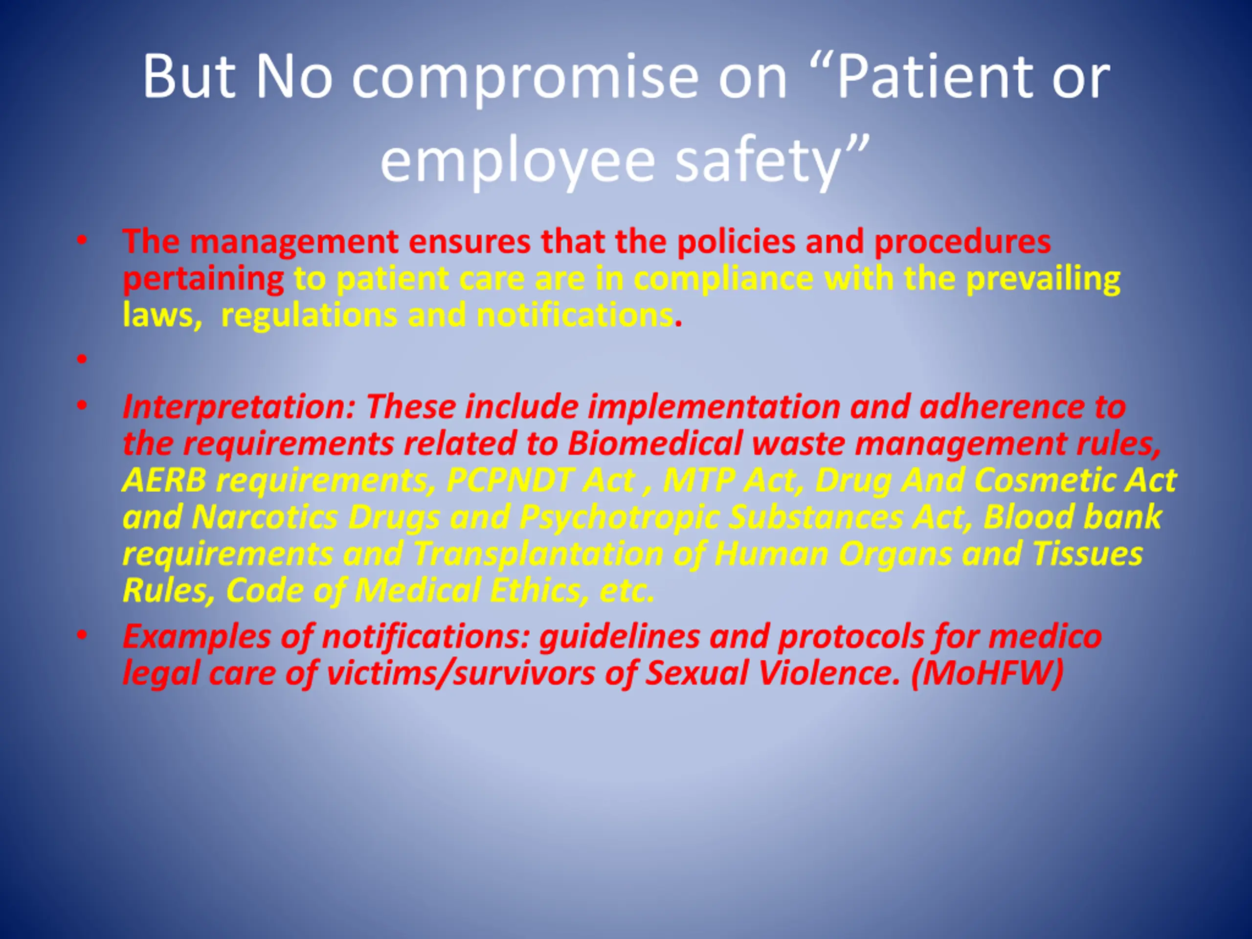 But No compromise on Patient or employee safety The management ensures that the policies and procedures pertaining to patient care are in compliance with the prevailing laws, regulations and notifications. Interpretation: These include implementation and adherence to the requirements related to Biomedical waste management rules, AERB requirements, PCPNDT Act , MTP Act, Drug And Cosmetic Act and Narcotics Drugs and Psychotropic Substances Act, Blood bank requirements and Transplantation of Human Organs and Tissues Rules, Code of Medical Ethics, etc. Examples of notifications: guidelines and protocols for medico legal care of victims/survivors of Sexual Violence. (MoHFW)