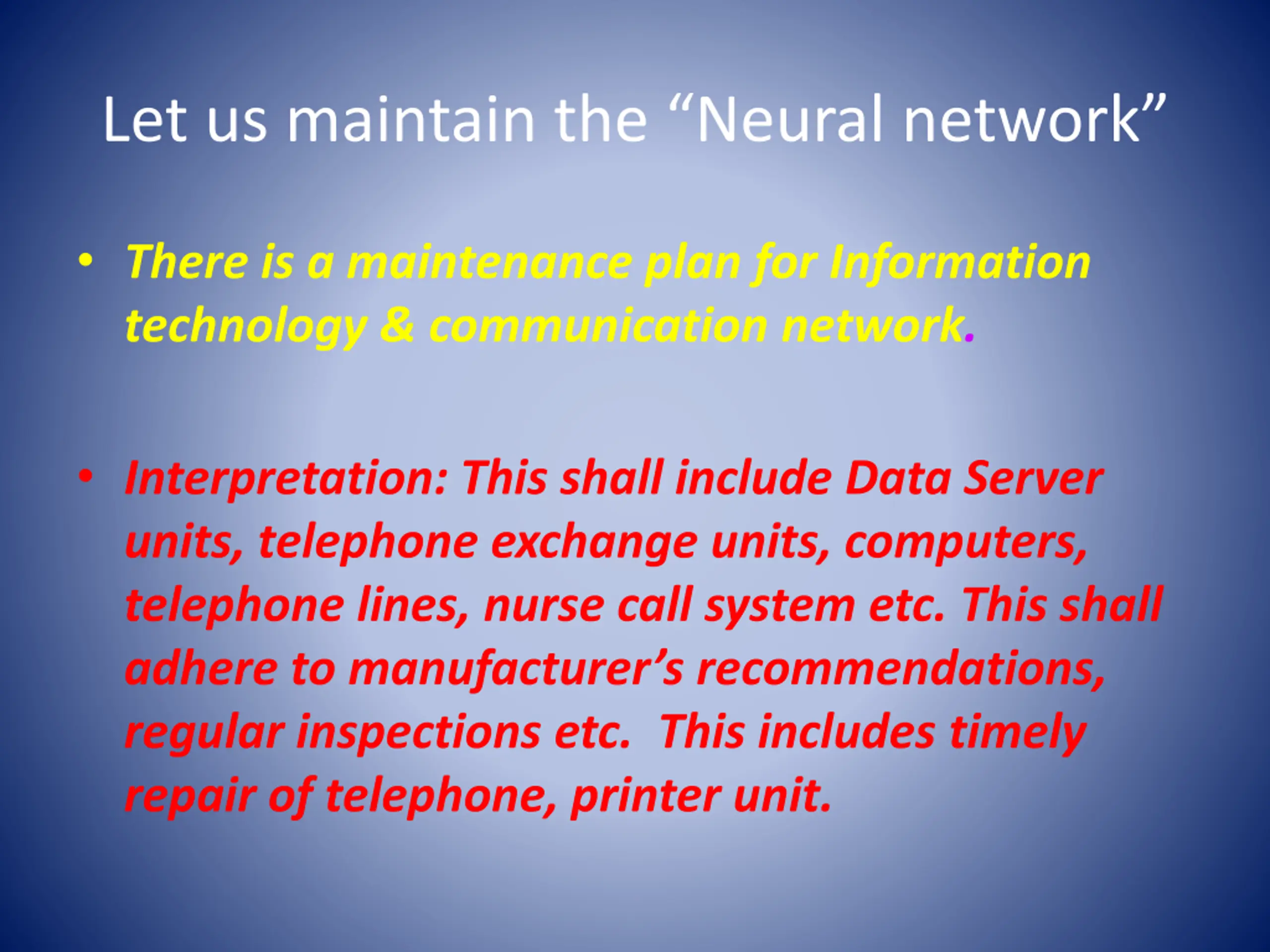 Let us maintain the Neural network There is a maintenance plan for Information technology & communication network. Interpretation: This shall include Data Server units, telephone exchange units, computers, telephone lines, nurse call system etc. This shall adhere to manufacturer s recommendations, regular inspections etc. This includes timely repair of telephone, printer unit.