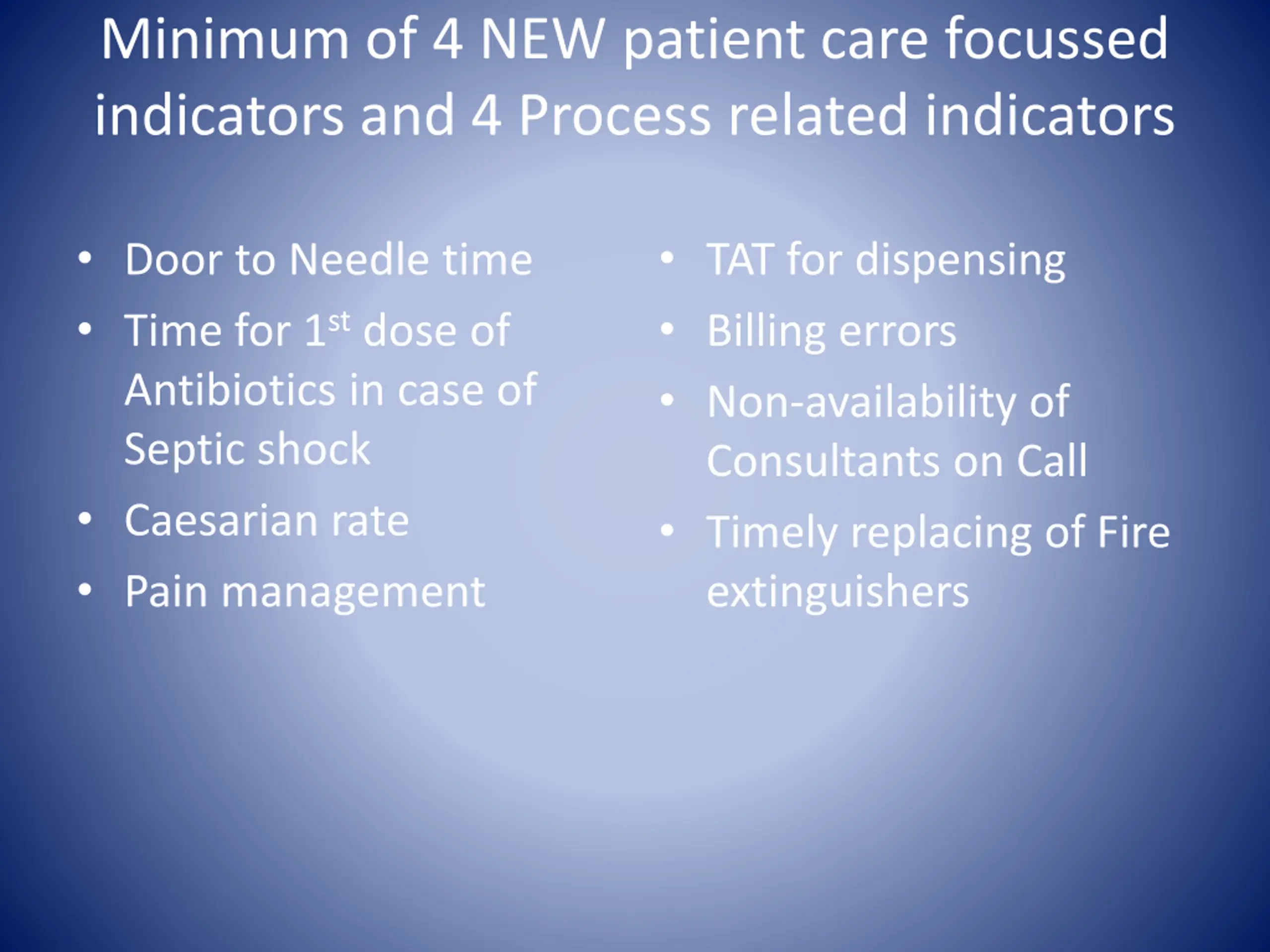 Minimum of 4 NEW patient care focussed indicators and 4 Process related indicators Door to Needle time Time for 1st dose of Antibiotics in case of Septic shock Caesarian rate Pain management TAT for dispensing Billing errors Non-availability of Consultants on Call Timely replacing of Fire extinguishers