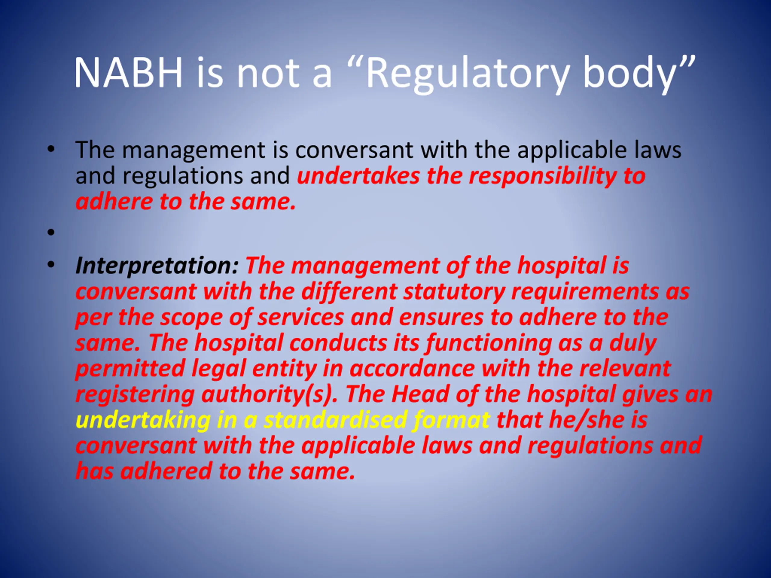 NABH is not a Regulatory body The management is conversant with the applicable laws and regulations and undertakes the responsibility to adhere to the same. Interpretation:The management of the hospital is conversant with the different statutory requirements as per the scope of services and ensures to adhere to the same. The hospital conducts its functioning as a duly permitted legal entity in accordance with the relevant registering authority(s). The Head of the hospital gives an undertaking in a standardised format that he/she is conversant with the applicable laws and regulations and has adhered to the same.