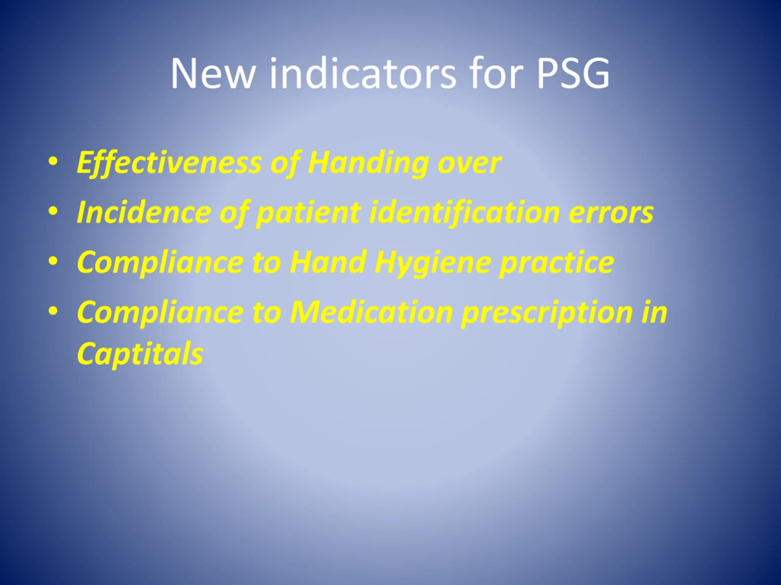 New indicators for PSG Effectiveness of Handing over Incidence of patient identification errors Compliance to Hand Hygiene practice Compliance to Medication prescription in Captitals