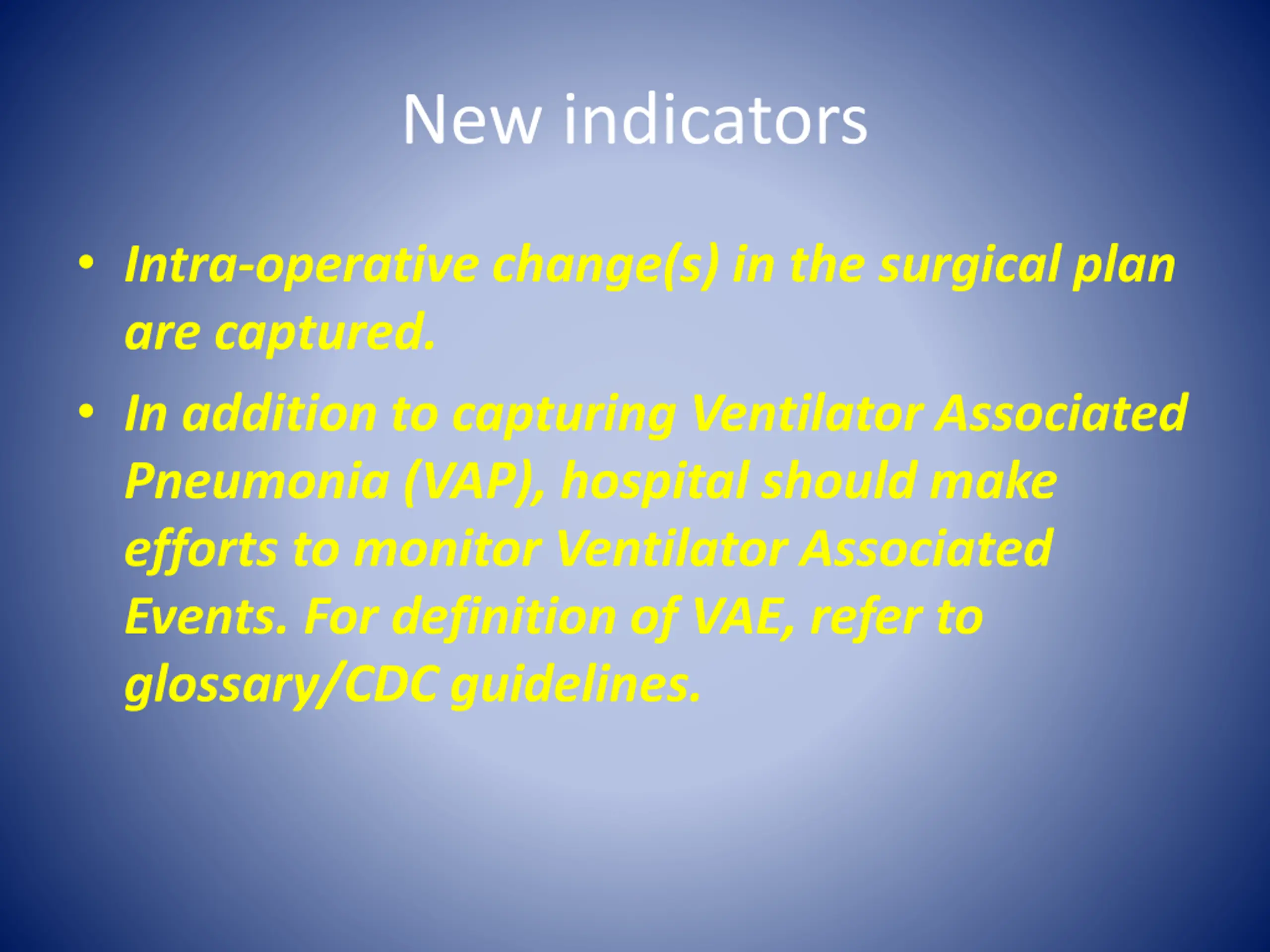 New indicators Intra-operative change(s) in the surgical plan are captured. In addition to capturing Ventilator Associated Pneumonia (VAP), hospital should make efforts to monitor Ventilator Associated Events. For definition of VAE, refer to glossary/CDC guidelines.