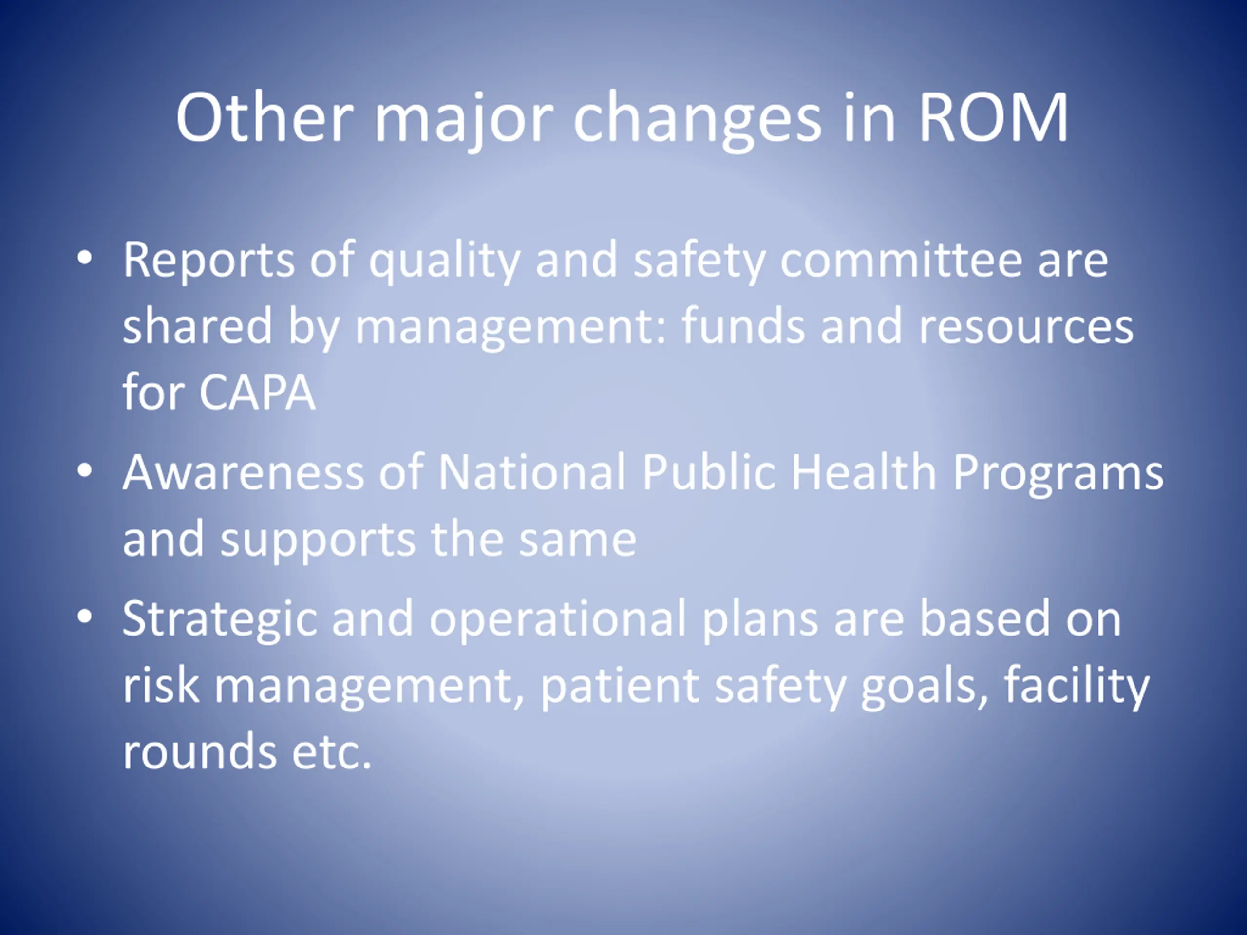 Other major changes in ROM Reports of quality and safety committee are shared by management: funds and resources for CAPA Awareness of National Public Health Programs and supports the same Strategic and operational plans are based on risk management, patient safety goals, facility rounds etc.