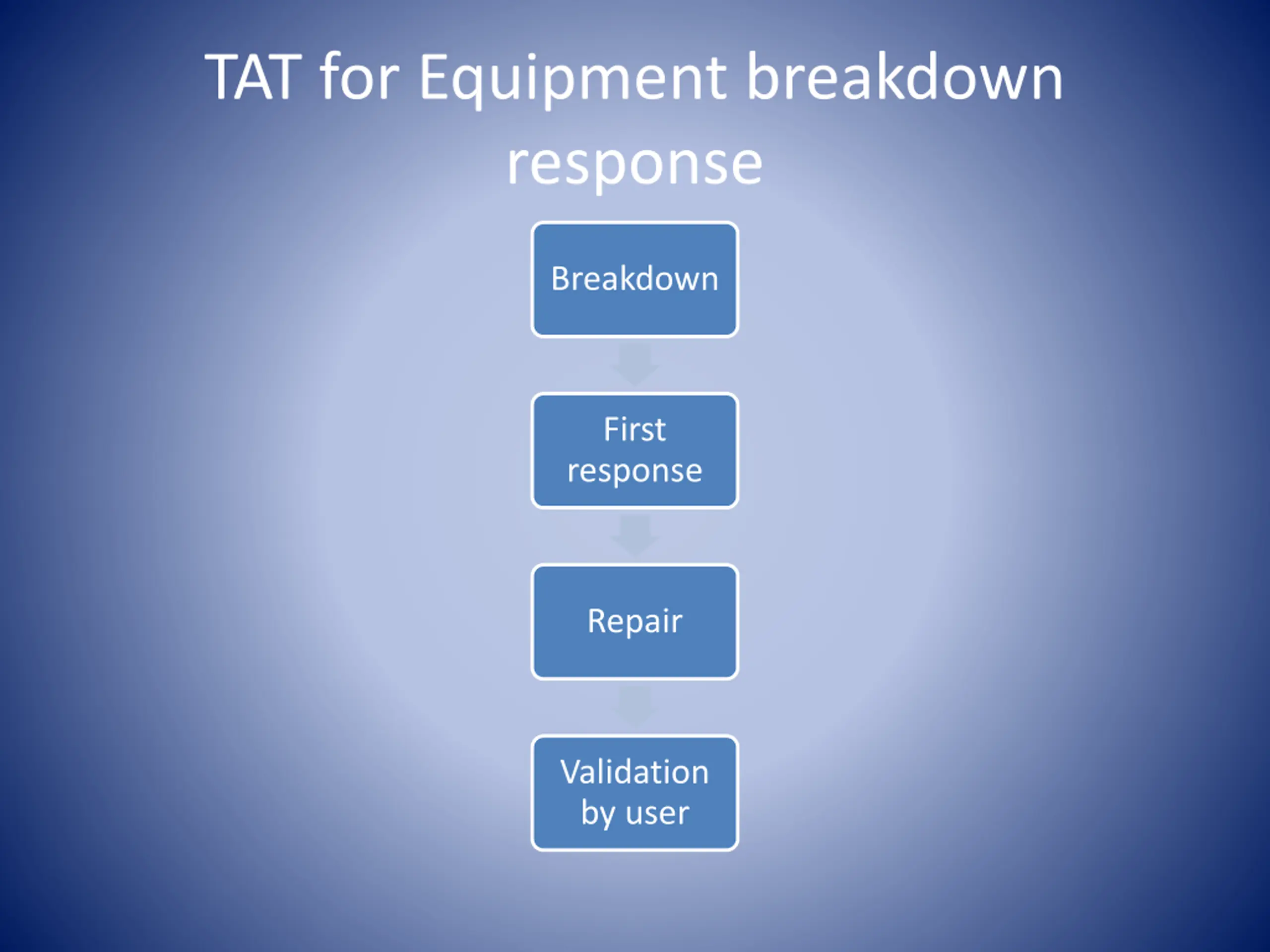 TAT for Equipment breakdown response Breakdown First response Repair Validation by user