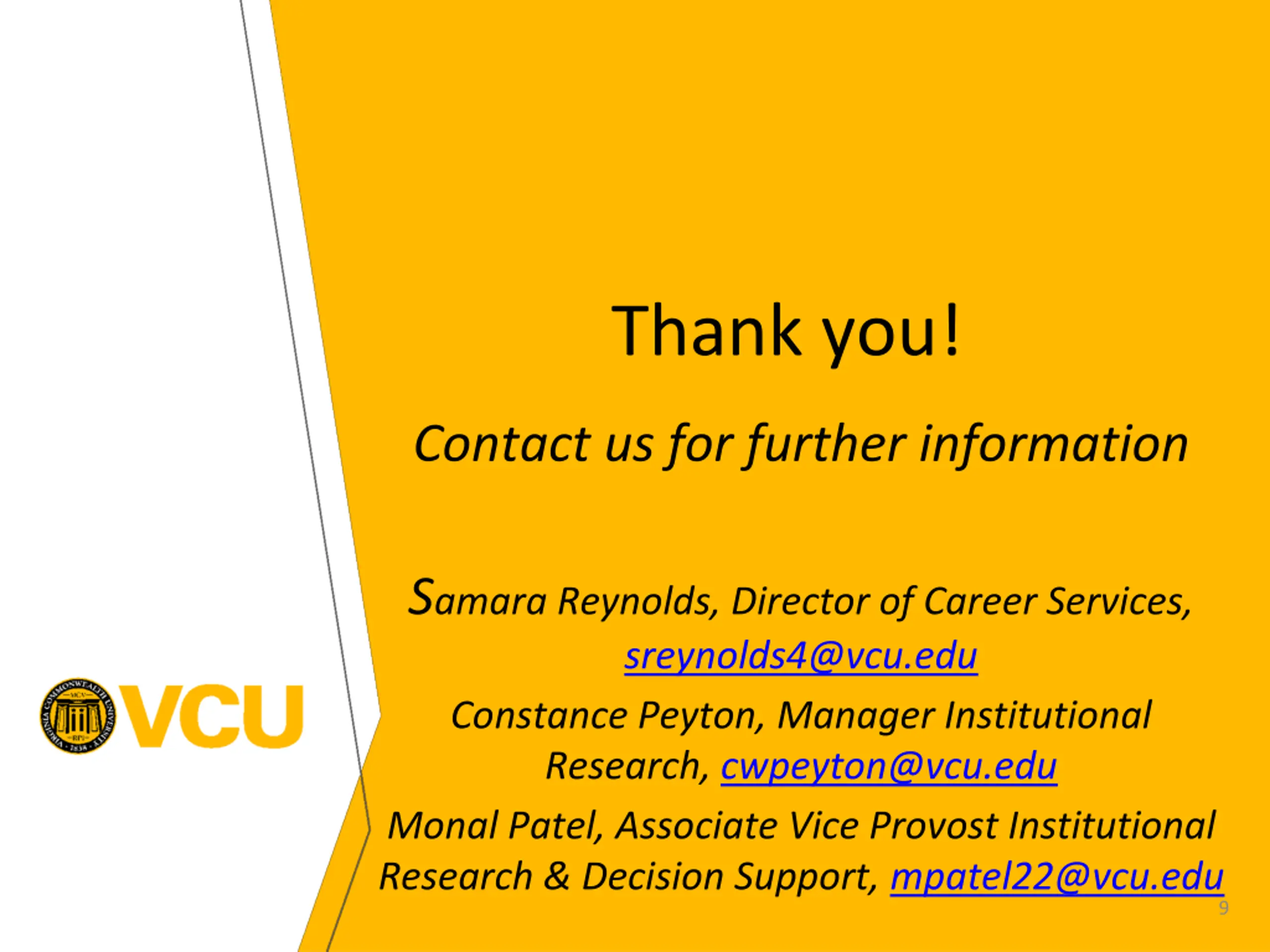 Thank you! Contact us for further information Samara Reynolds, Director of Career Services, sreynolds4@vcu.edu Constance Peyton, Manager Institutional Research, cwpeyton@vcu.edu Monal Patel, Associate Vice Provost Institutional Research & Decision Support, mpatel22@vcu.edu 9