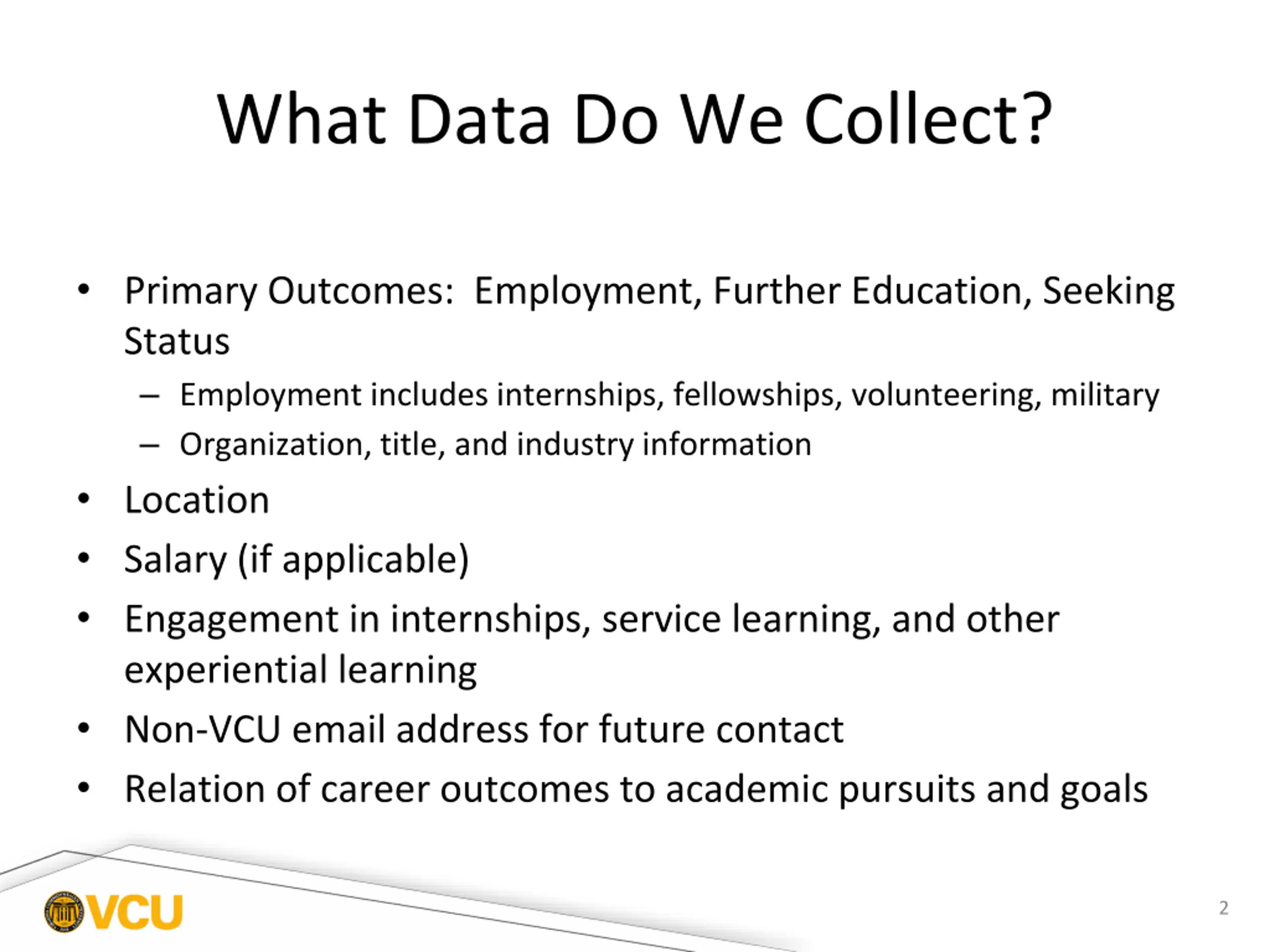 What Data Do We Collect? Primary Outcomes: Employment, Further Education, Seeking Status Employment includes internships, fellowships, volunteering, military Organization, title, and industry information Location Salary (if applicable) Engagement in internships, service learning, and other experiential learning Non-VCU email address for future contact Relation of career outcomes to academic pursuits and goals 2