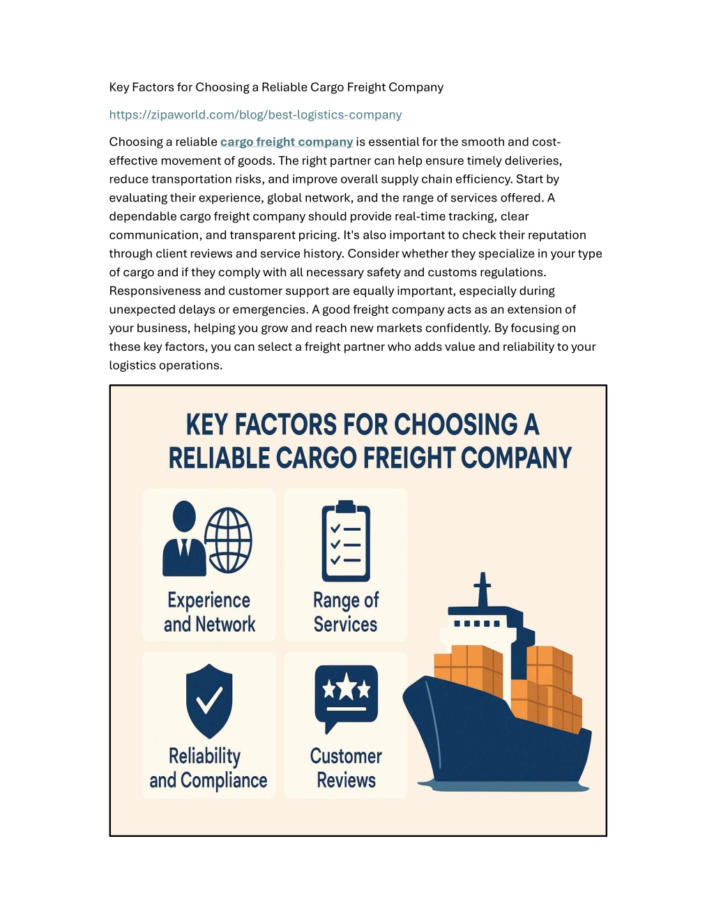 Key Factors for Choosing a Reliable Cargo Freight Company https://zipaworld.com/blog/best-logistics-company Choosing a reliable cargo freight company is essential for the smooth and cost- e?ective movement of goods. The right partner can help ensure timely deliveries, reduce transportation risks, and improve overall supply chain e?iciency. Start by evaluating their experience, global network, and the range of services o?ered. A dependable cargo freight company should provide real-time tracking, clear communication, and transparent pricing. It's also important to check their reputation through client reviews and service history. Consider whether they specialize in your type of cargo and if they comply with all necessary safety and customs regulations. Responsiveness and customer support are equally important, especially during unexpected delays or emergencies. A good freight company acts as an extension of your business, helping you grow and reach new markets confidently. By focusing on these key factors, you can select a freight partner who adds value and reliability to your logistics operations.