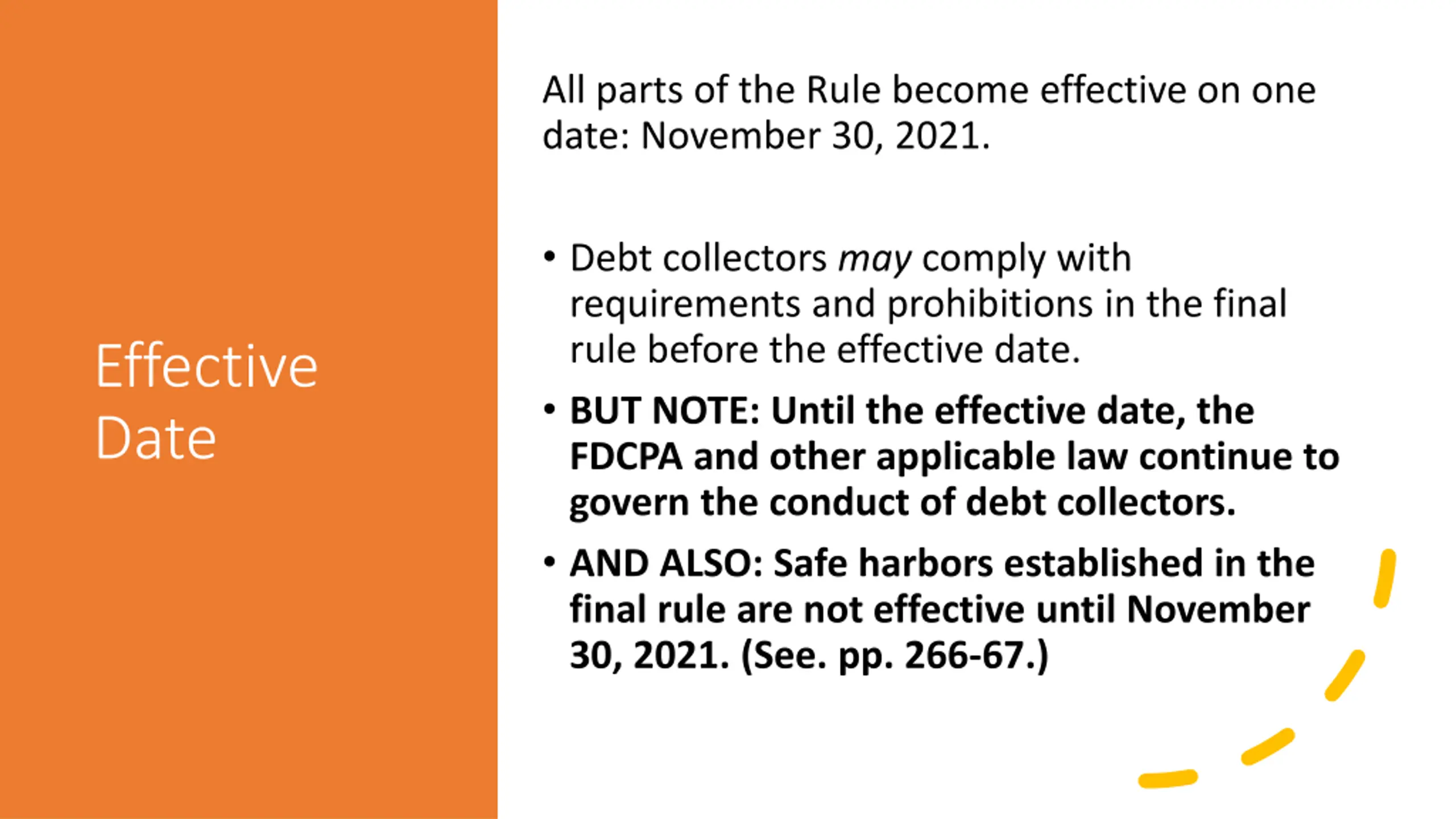 All parts of the Rule become effective on one date: November 30, 2021. Debt collectors may comply with requirements and prohibitions in the final rule before the effective date. BUT NOTE: Until the effective date, the FDCPA and other applicable law continue to govern the conduct of debt collectors. AND ALSO: Safe harbors established in the final rule are not effective until November 30, 2021. (See. pp. 266-67.) Effective Date