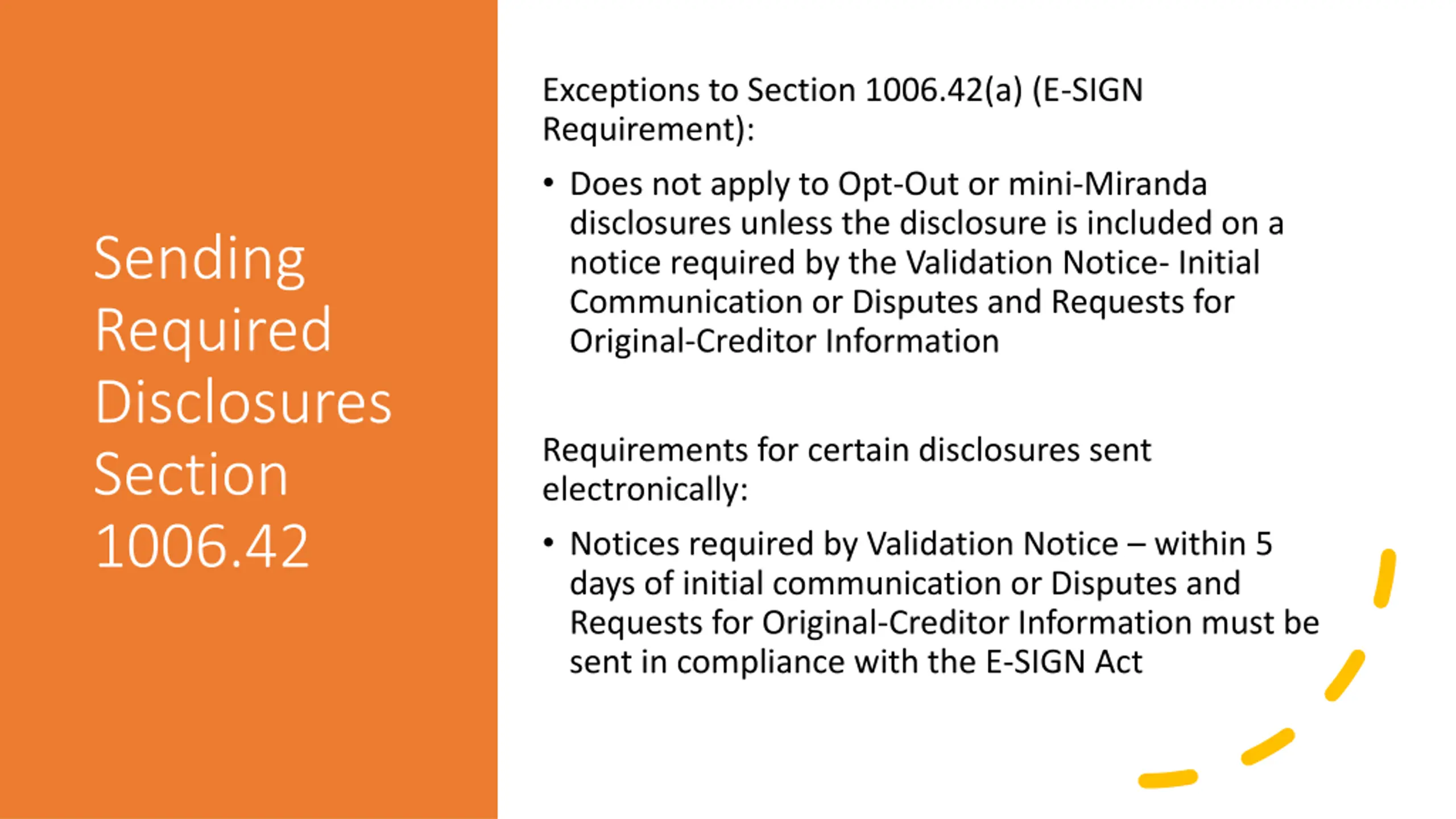 Exceptions to Section 1006.42(a) (E-SIGN Requirement): Does not apply to Opt-Out or mini-Miranda disclosures unless the disclosure is included on a notice required by the Validation Notice- Initial Communication or Disputes and Requests for Original-Creditor Information Sending Required Disclosures Section 1006.42 Requirements for certain disclosures sent electronically: Notices required by Validation Notice within 5 days of initial communication or Disputes and Requests for Original-Creditor Information must be sent in compliance with the E-SIGN Act