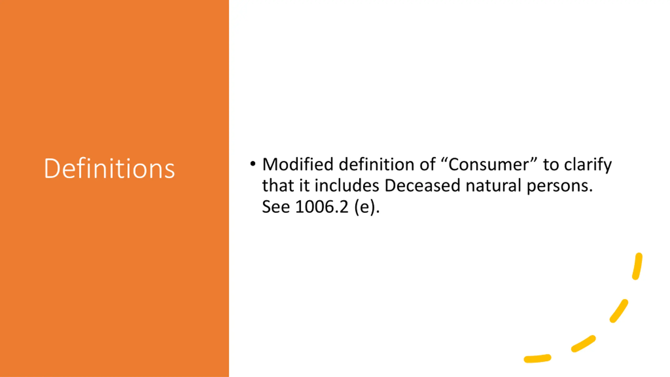 Modified definition of Consumer to clarify that it includes Deceased natural persons. See 1006.2 (e). Definitions