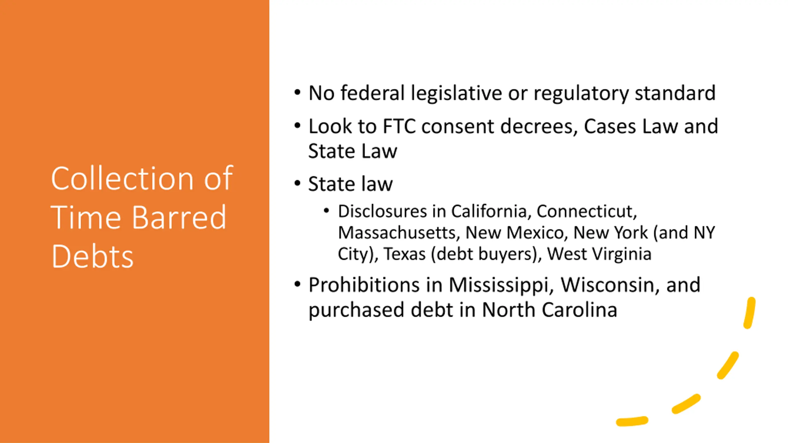 No federal legislative or regulatory standard Look to FTC consent decrees, Cases Law and State Law State law Disclosures in California, Connecticut, Massachusetts, New Mexico, New York (and NY City), Texas (debt buyers), West Virginia Prohibitions in Mississippi, Wisconsin, and purchased debt in North Carolina Collection of Time Barred Debts