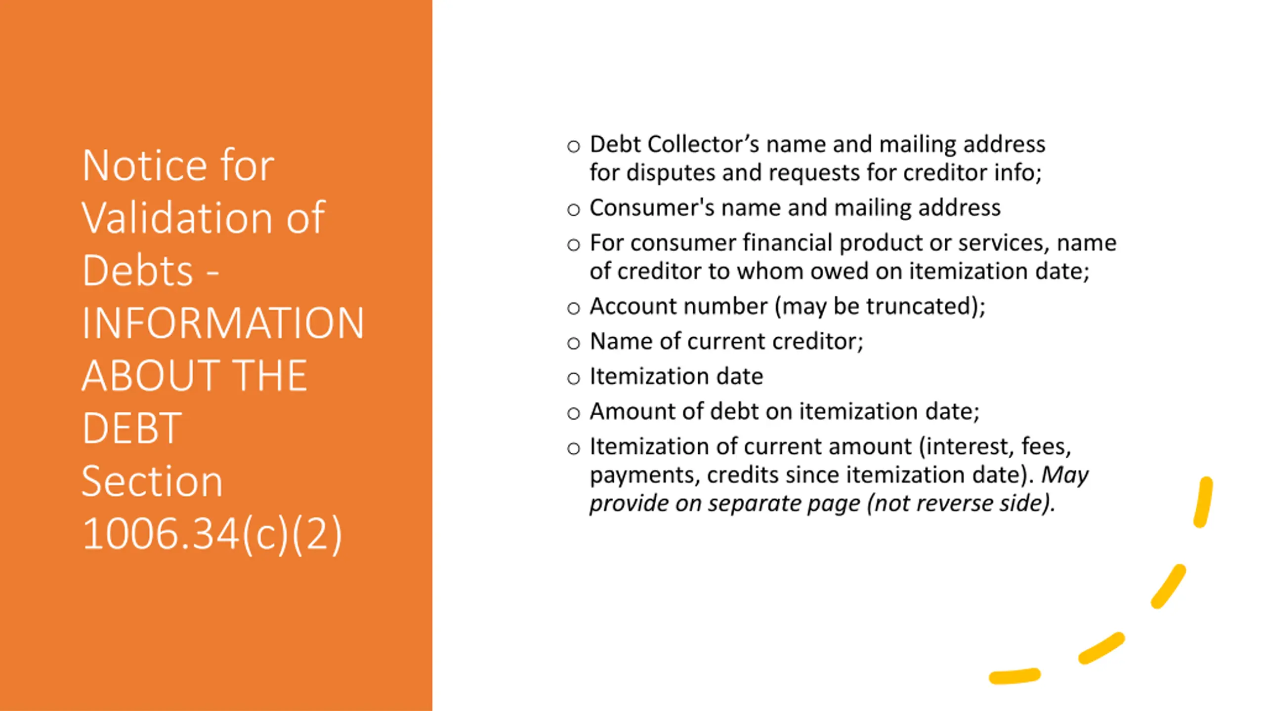 o Debt Collectors name and mailing address for disputes and requests for creditor info; o Consumer's name and mailing address o For consumer financial product or services, name of creditor to whom owed on itemization date; o Account number (may be truncated); o Name of current creditor; o Itemization date o Amount of debt on itemization date; o Itemization of current amount (interest, fees, payments, credits since itemization date). May provide on separate page (not reverse side). Notice for Validation of Debts - INFORMATION ABOUT THE DEBT Section 1006.34(c)(2)