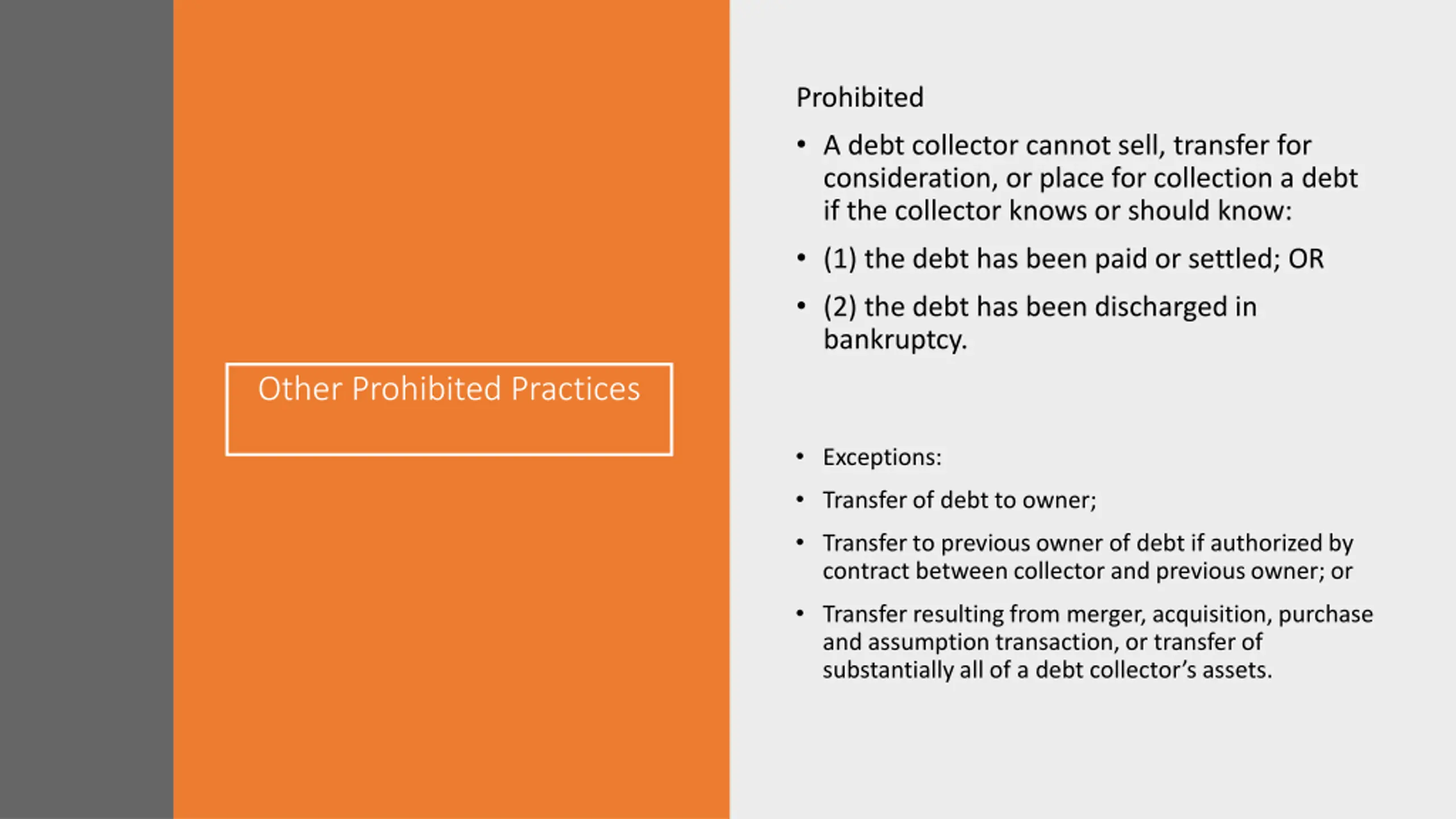 Prohibited A debt collector cannot sell, transfer for consideration, or place for collection a debt if the collector knows or should know: (1) the debt has been paid or settled; OR (2) the debt has been discharged in bankruptcy. Other Prohibited Practices Exceptions: Transfer of debt to owner; Transfer to previous owner of debt if authorized by contract between collector and previous owner; or Transfer resulting from merger, acquisition, purchase and assumption transaction, or transfer of substantially all of a debt collector s assets.