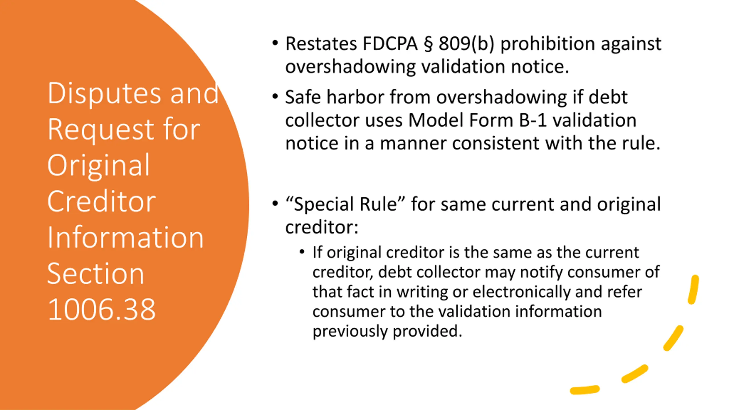 Restates FDCPA 809(b) prohibition against overshadowing validation notice. Safe harbor from overshadowing if debt collector uses Model Form B-1 validation notice in a manner consistent with the rule. Disputes and Request for Original Creditor Information Section 1006.38 Special Rule for same current and original creditor: If original creditor is the same as the current creditor, debt collector may notify consumer of that fact in writing or electronically and refer consumer to the validation information previously provided.
