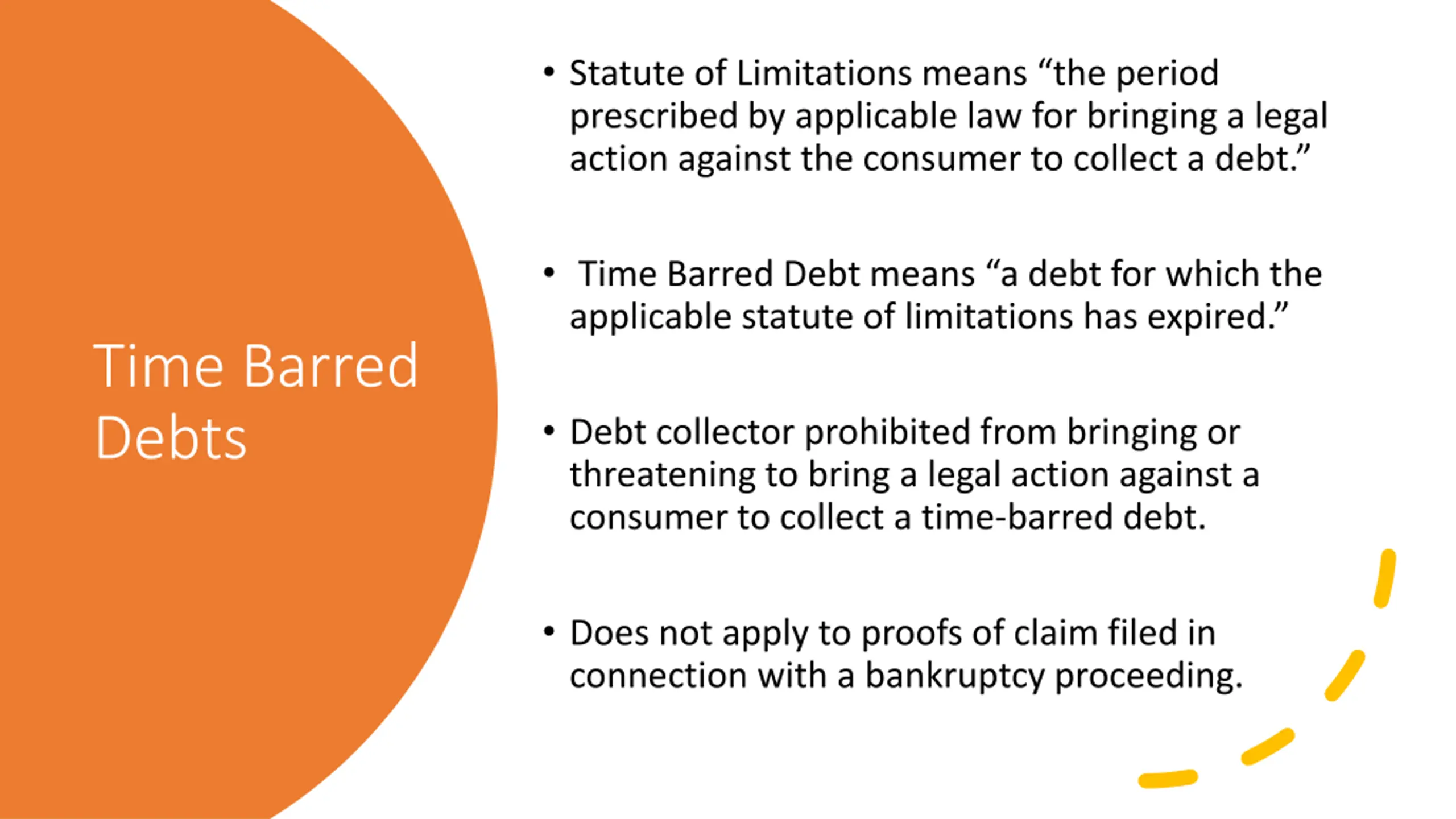Statute of Limitations means the period prescribed by applicable law for bringing a legal action against the consumer to collect a debt. Time Barred Debt means a debt for which the applicable statute of limitations has expired. Time Barred Debts Debt collector prohibited from bringing or threatening to bring a legal action against a consumer to collect a time-barred debt. Does not apply to proofs of claim filed in connection with a bankruptcy proceeding.