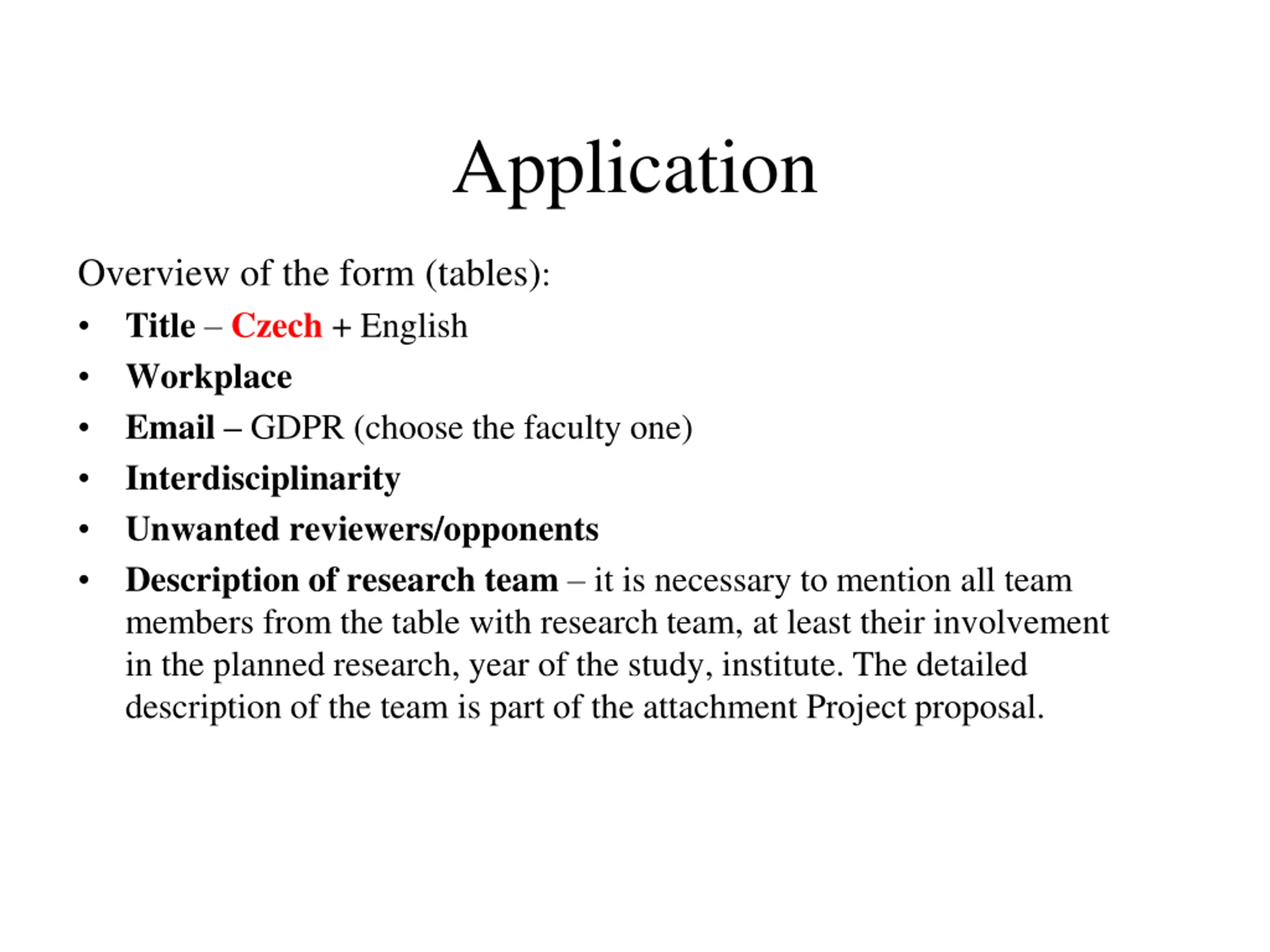 Application Overview of the form (tables): Title Czech + English Workplace Email GDPR (choose the faculty one) Interdisciplinarity Unwanted reviewers/opponents Description of research team it is necessary to mention all team members from the table with research team, at least their involvement in the planned research, year of the study, institute. The detailed description of the team is part of the attachment Project proposal.