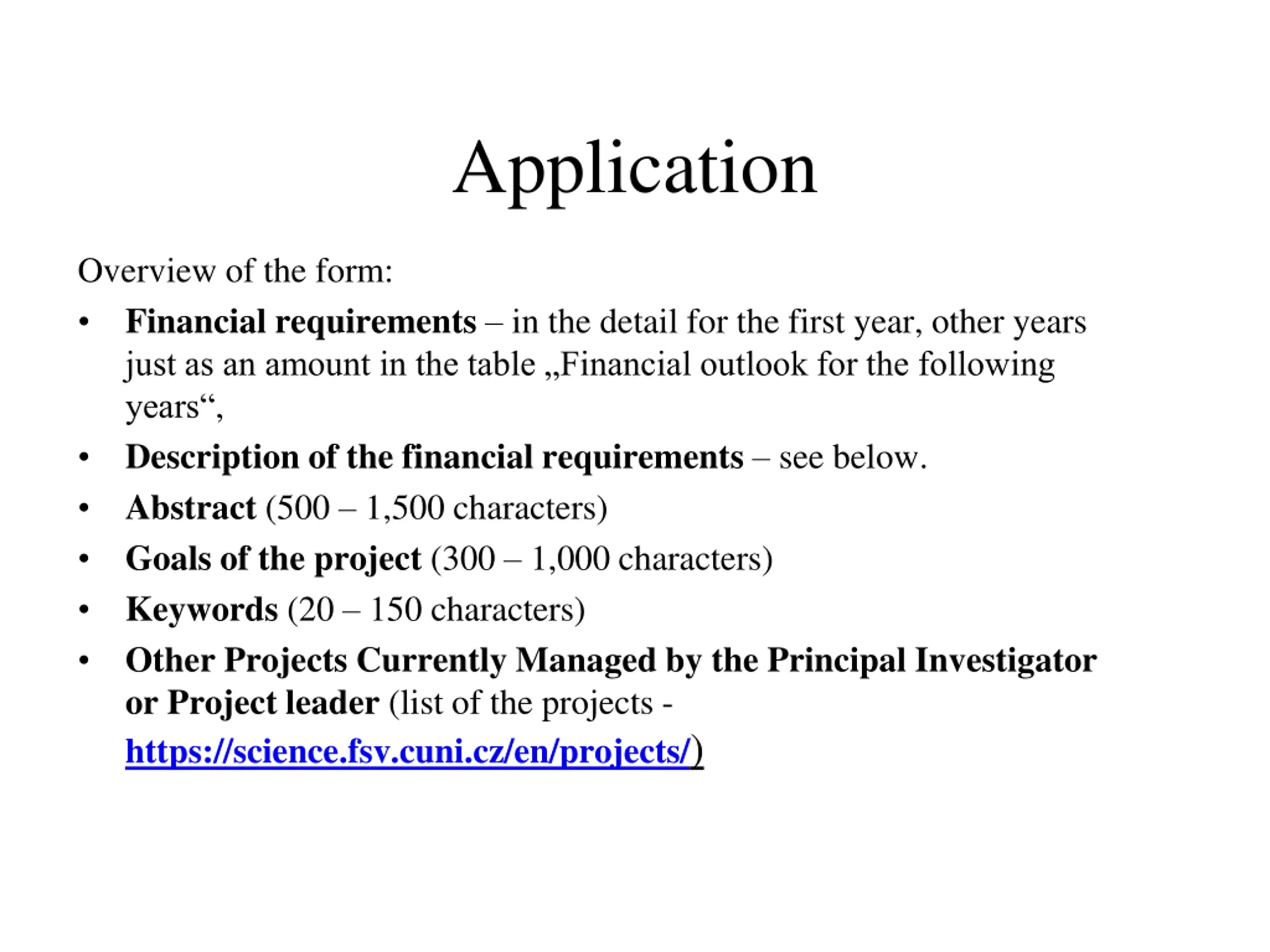 Application Overview of the form: Financial requirements in the detail for the first year, other years just as an amount in the table Financial outlook for the following years , Description of the financial requirements see below. Abstract (500 1,500 characters) Goals of the project (300 1,000 characters) Keywords (20 150 characters) Other Projects Currently Managed by the Principal Investigator or Project leader (list of the projects - https://science.fsv.cuni.cz/en/projects/)