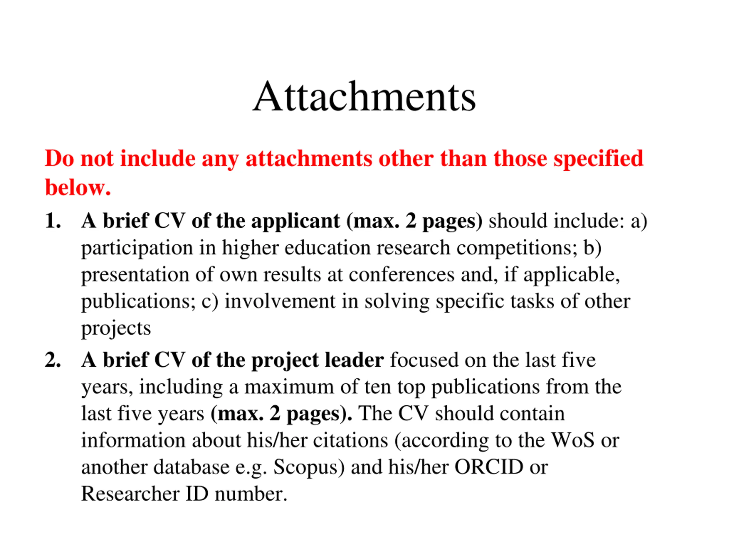 Attachments Do not include any attachments other than those specified below. 1. A brief CV of the applicant (max. 2 pages) should include: a) participation in higher education research competitions; b) presentation of own results at conferences and, if applicable, publications; c) involvement in solving specific tasks of other projects 2. A brief CV of the project leader focused on the last five years, including a maximum of ten top publications from the last five years (max. 2 pages). The CV should contain information about his/her citations (according to the WoS or another database e.g. Scopus) and his/her ORCID or Researcher ID number.