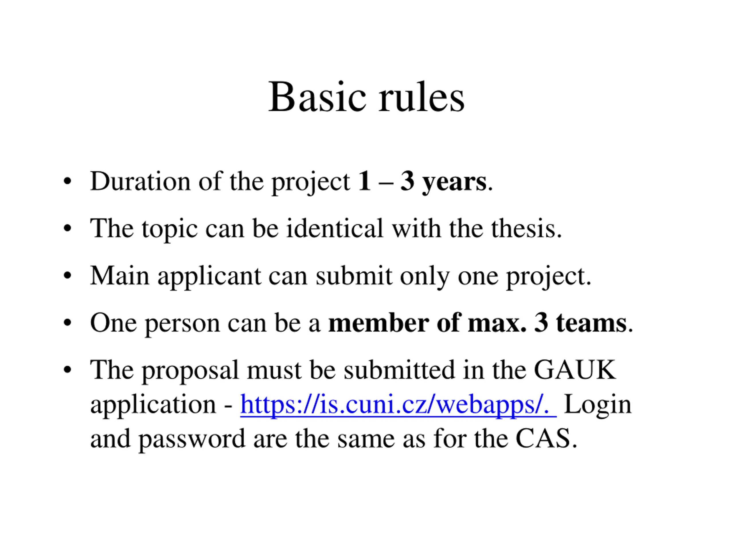 Basic rules Duration of the project 1 3 years. The topic can be identical with the thesis. Main applicant can submit only one project. One person can be a member of max. 3 teams. The proposal must be submitted in the GAUK application - https://is.cuni.cz/webapps/. Login and password are the same as for the CAS.