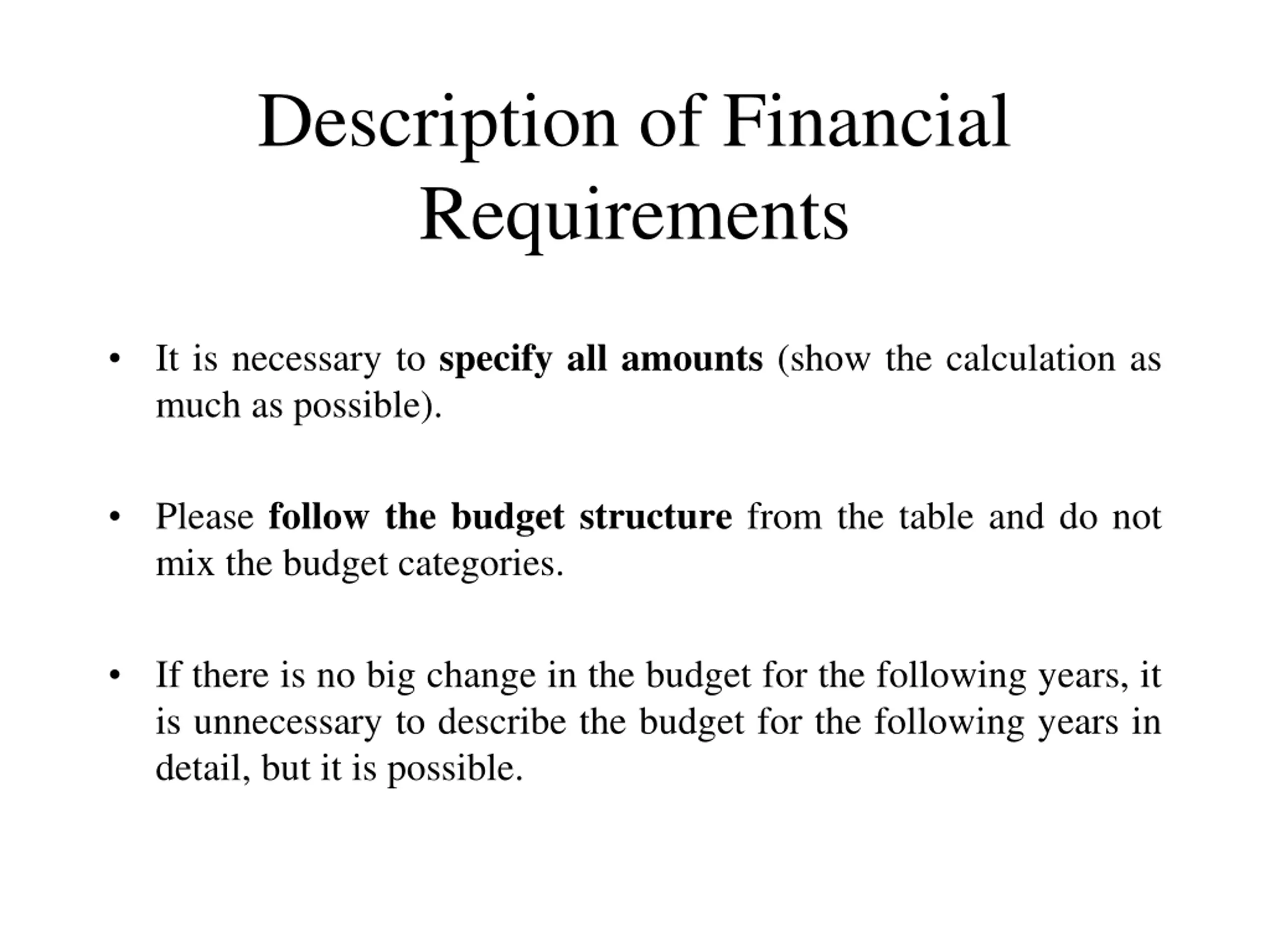 Description of Financial Requirements It is necessary to specify all amounts (show the calculation as much as possible). Please follow the budget structure from the table and do not mix the budget categories. If there is no big change in the budget for the following years, it is unnecessary to describe the budget for the following years in detail, but it is possible.