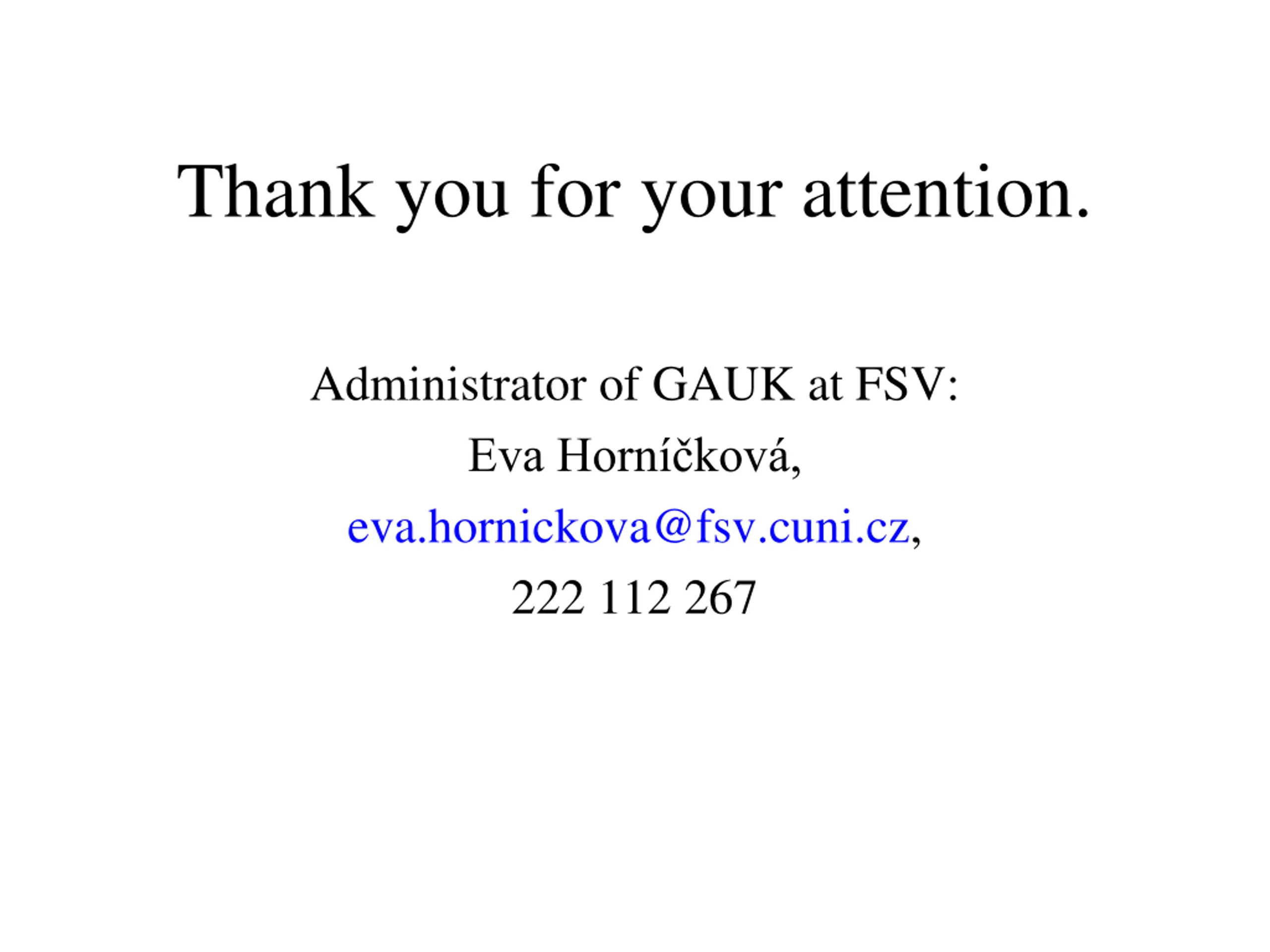 Thank you for your attention. Administrator of GAUK at FSV: Eva Horn kov , eva.hornickova@fsv.cuni.cz, 222 112 267