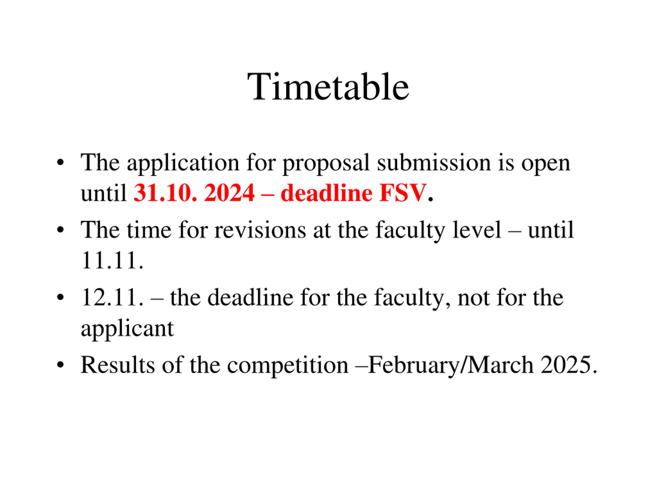 Timetable The application for proposal submission is open until 31.10. 2024 deadline FSV. The time for revisions at the faculty level until 11.11. 12.11. the deadline for the faculty, not for the applicant Results of the competition February/March 2025.