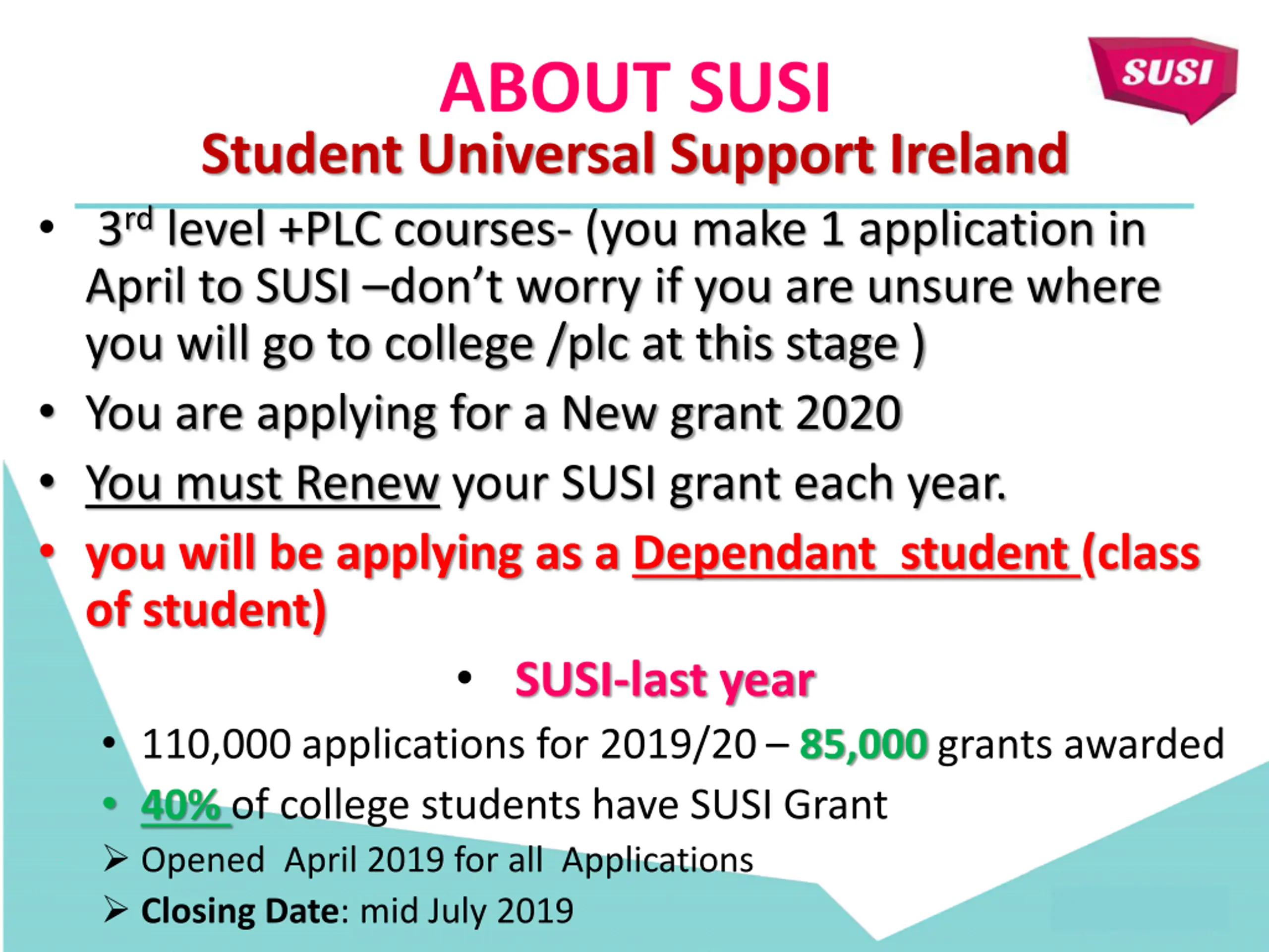 ABOUT SUSI Student Universal Support Ireland 3rd level +PLC courses- (you make 1 application in April to SUSI don t worry if you are unsure where you will go to college /plc at this stage ) You are applying for a New grant 2020 You must Renew your SUSI grant each year. you will be applying as a Dependant student (class of student) SUSI-last year 110,000 applications for 2019/20 85,000 grants awarded 40% of college students have SUSI Grant Opened April 2019 for all Applications Closing Date: mid July 2019