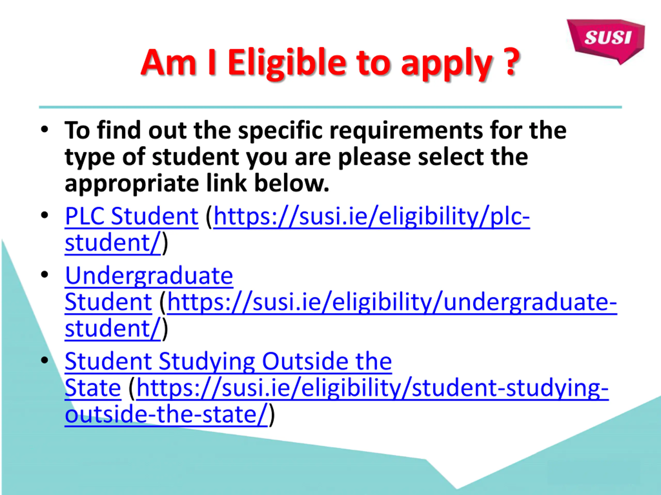 Am I Eligible to apply ? To find out the specific requirements for the type of student you are please select the appropriate link below. PLC Student (https://susi.ie/eligibility/plc- student/) Undergraduate Student (https://susi.ie/eligibility/undergraduate- student/) Student Studying Outside the State (https://susi.ie/eligibility/student-studying- outside-the-state/)