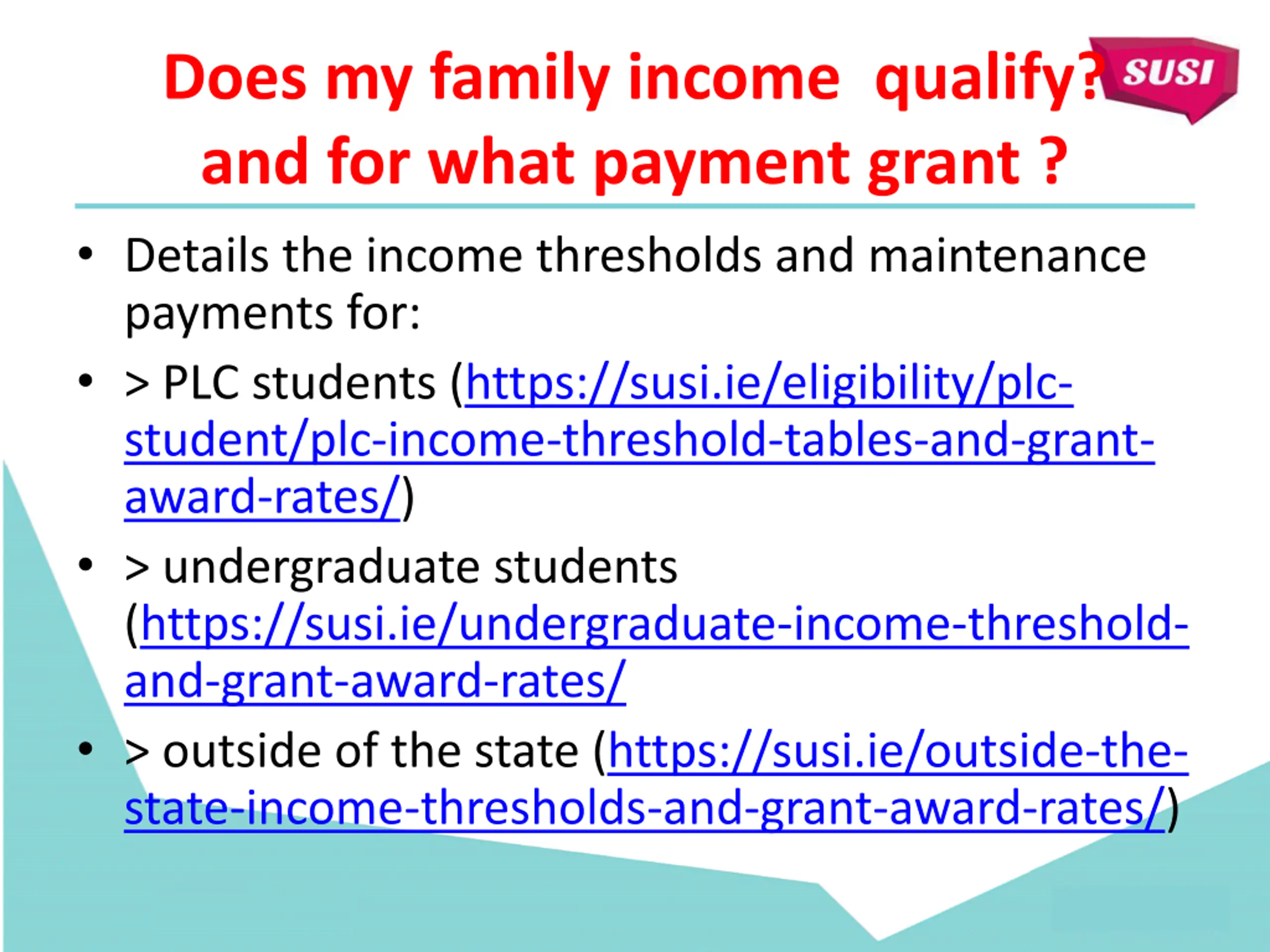 Does my family income qualify? and for what payment grant ? Details the income thresholds and maintenance payments for: > PLC students (https://susi.ie/eligibility/plc- student/plc-income-threshold-tables-and-grant- award-rates/) > undergraduate students (https://susi.ie/undergraduate-income-threshold- and-grant-award-rates/ > outside of the state (https://susi.ie/outside-the- state-income-thresholds-and-grant-award-rates/)