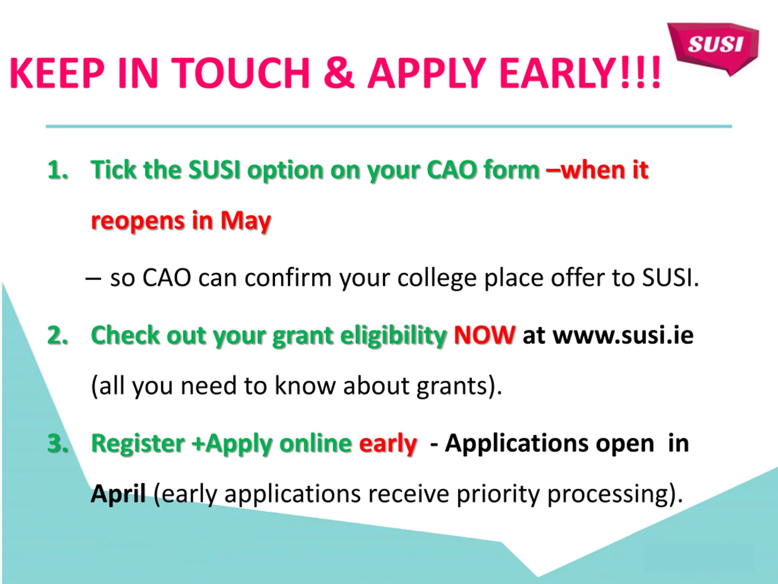 KEEP IN TOUCH & APPLY EARLY!!! 1. Tick the SUSI option on your CAO form when it reopens in May so CAO can confirm your college place offer to SUSI. 2. Check out your grant eligibility NOW at www.susi.ie (all you need to know about grants). 3. Register +Apply online early - Applications open in April (early applications receive priority processing).