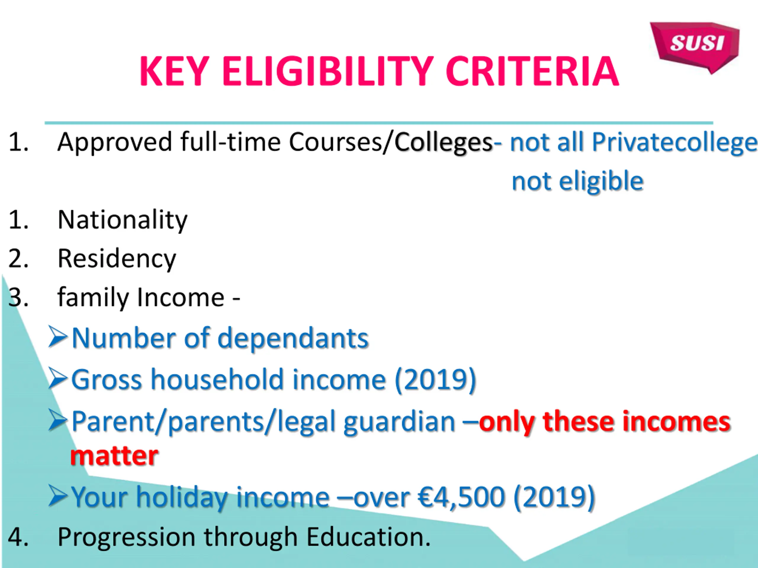 KEY ELIGIBILITY CRITERIA 1. Approved full-time Courses/Colleges- not all Privatecolleges not eligible 1. Nationality 2. Residency 3. family Income - Number of dependants Gross household income (2019) Parent/parents/legal guardian onlythese incomes matter Your holiday income over 4,500 (2019) 4. Progression through Education.