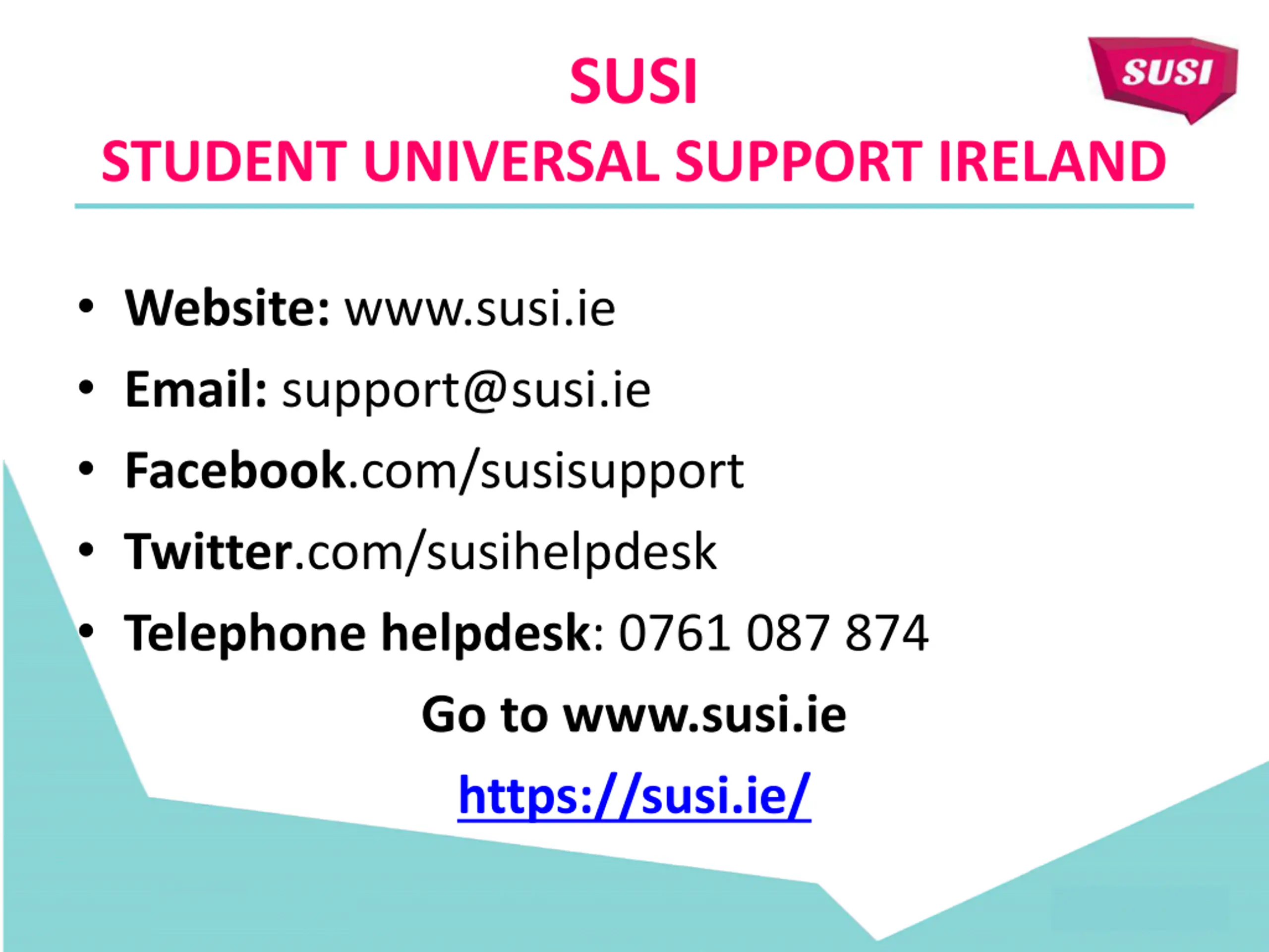SUSI STUDENT UNIVERSAL SUPPORT IRELAND Website: www.susi.ie Email: support@susi.ie Facebook.com/susisupport Twitter.com/susihelpdesk Telephone helpdesk: 0761 087 874 Go to www.susi.ie https://susi.ie/