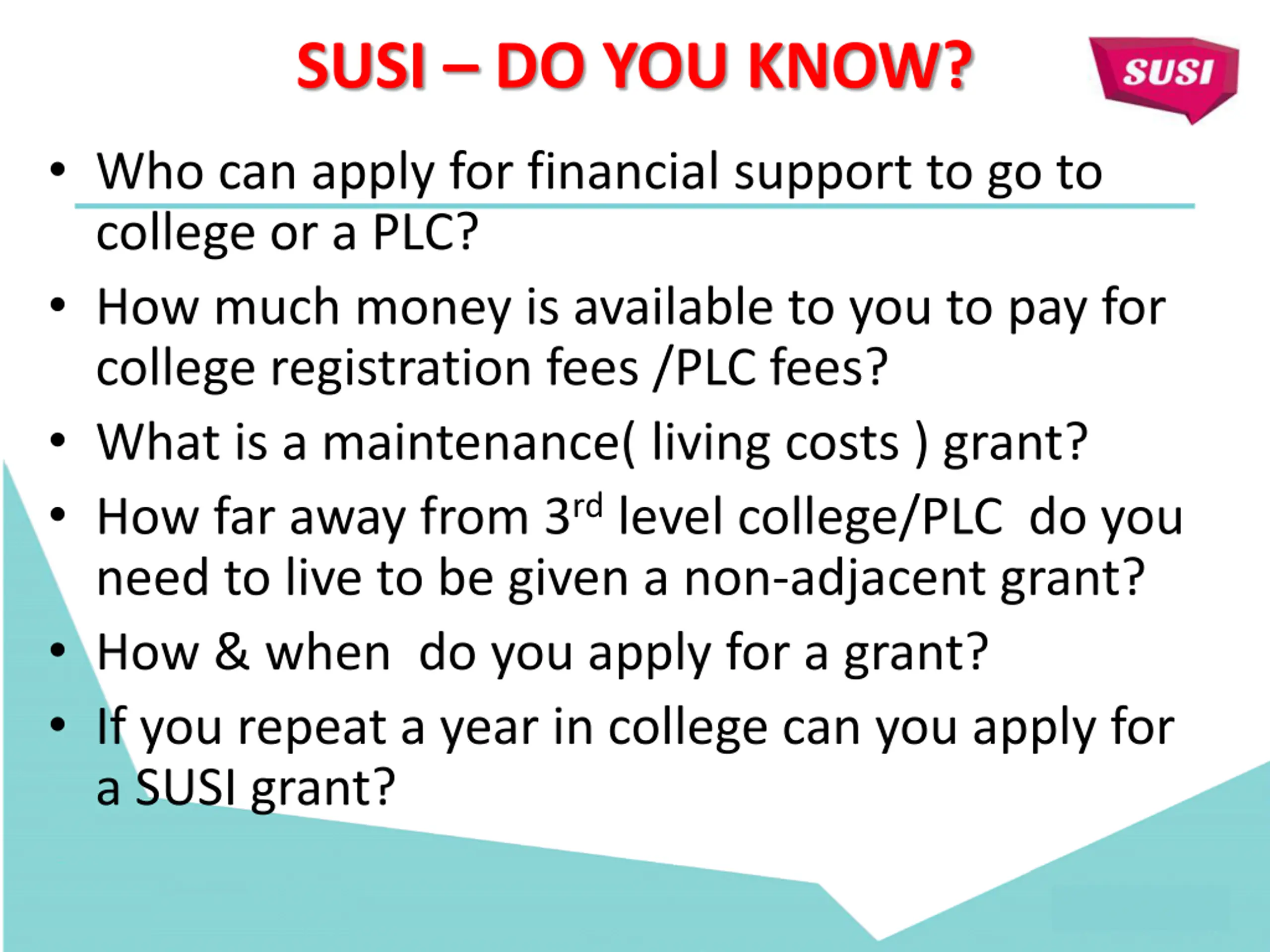 SUSI DO YOU KNOW? Who can apply for financial support to go to college or a PLC? How much money is available to you to pay for college registration fees /PLC fees? What is a maintenance( living costs ) grant? How far away from 3rd level college/PLC do you need to live to be given a non-adjacent grant? How & when do you apply for a grant? If you repeat a year in college can you apply for a SUSI grant?