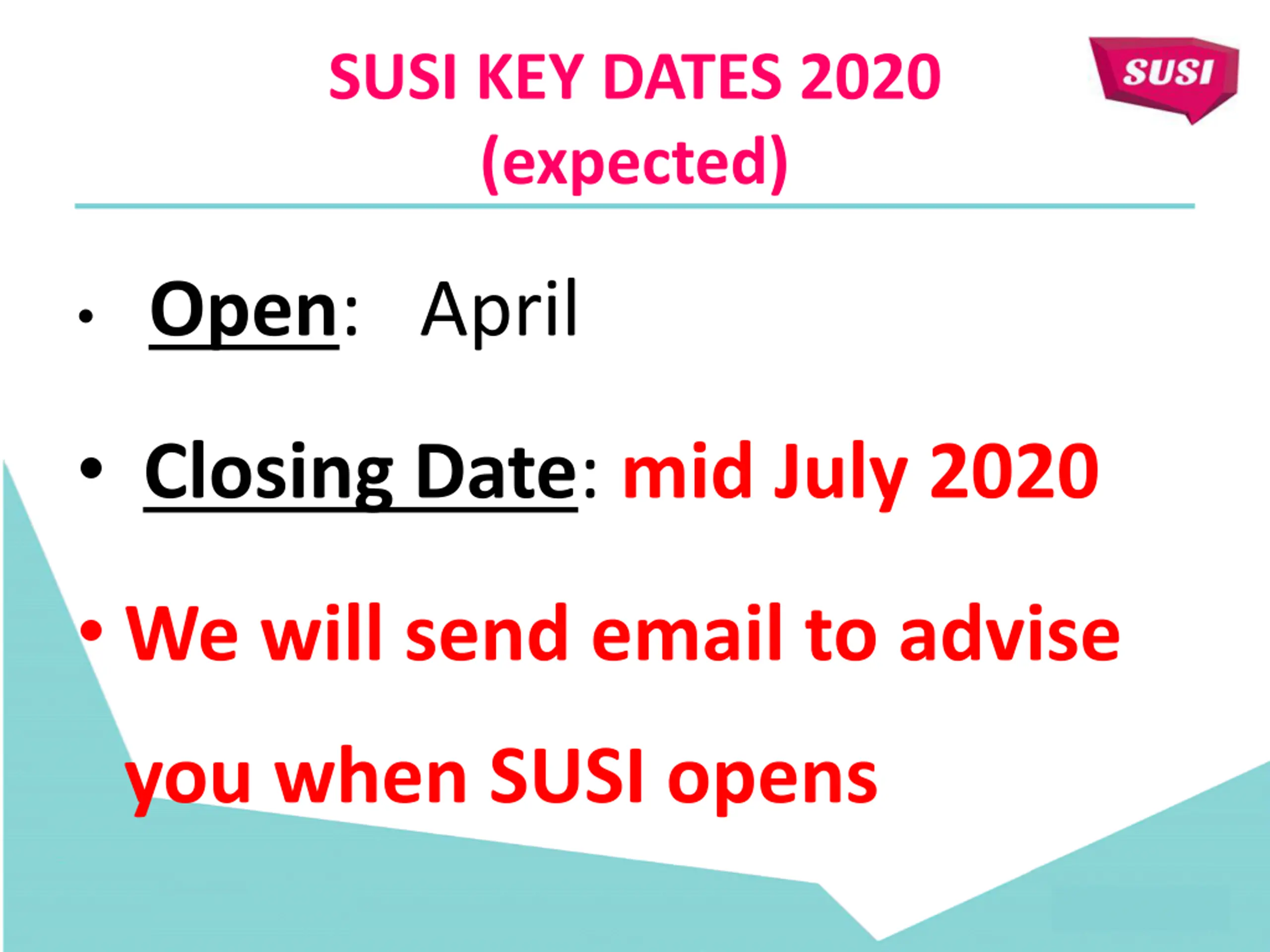 SUSI KEY DATES 2020 (expected) Open: April Closing Date: mid July 2020 We will send email to advise you when SUSI opens