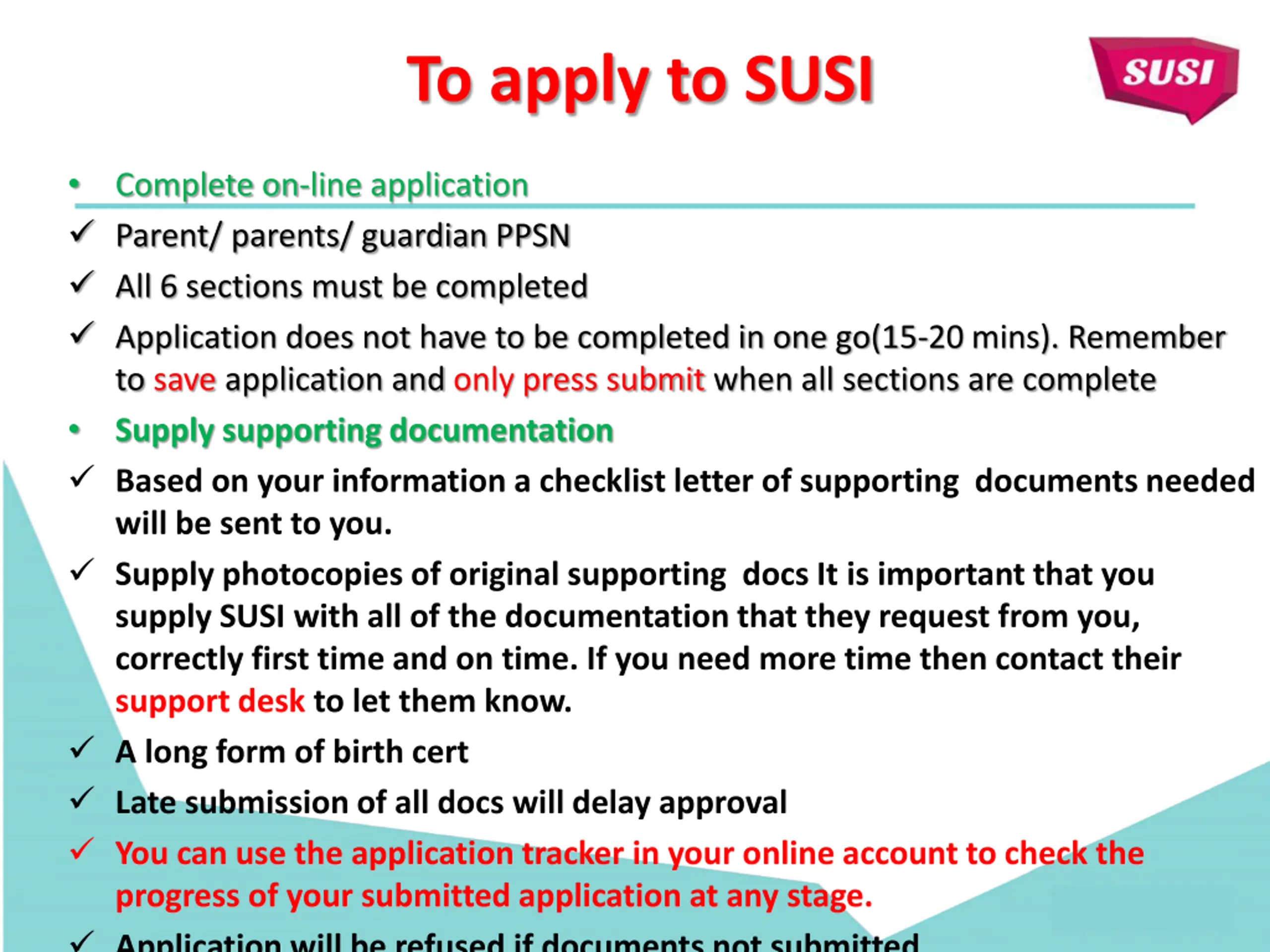 To apply to SUSI Parent/ parents/ guardian PPSN All 6 sections must be completed Application does not have to be completed in one go(15-20 mins). Remember to save application and only press submit when all sections are complete Supply supporting documentation Based on your information a checklist letter of supporting documents needed will be sent to you. Supply photocopies of original supporting docs It is important that you supply SUSI with all of the documentation that they request from you, correctly first time and on time. If you need more time then contact their support desk to let them know. A long form of birth cert Late submission of all docs will delay approval You can use the application tracker in your online account to check the progress of your submitted application at any stage. Application will be refused if documents not submitted. Complete on-line application