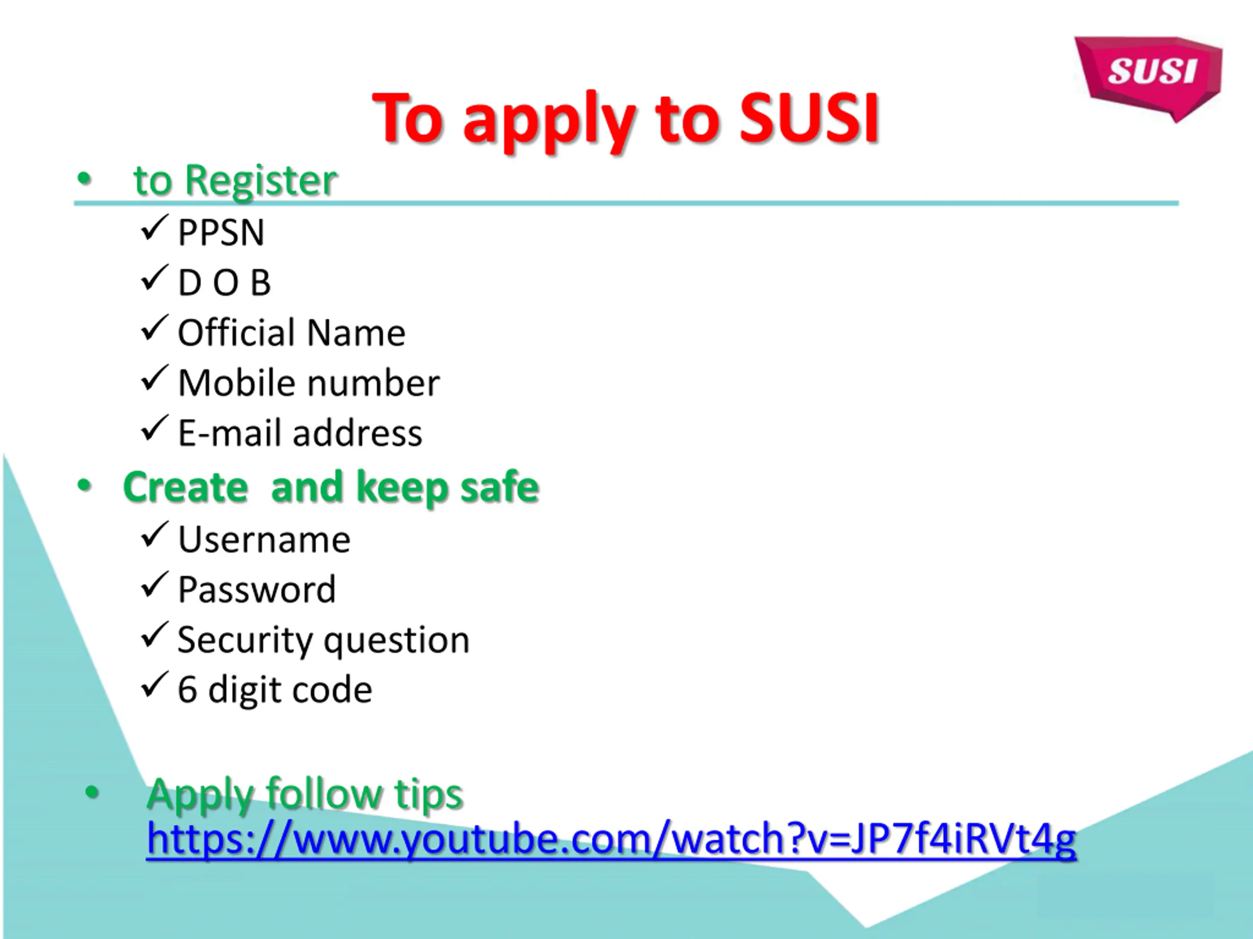 To apply to SUSI to Register PPSN D O B Official Name Mobile number E-mail address Create and keep safe Username Password Security question 6 digit code Apply follow tips https://www.youtube.com/watch?v=JP7f4iRVt4g