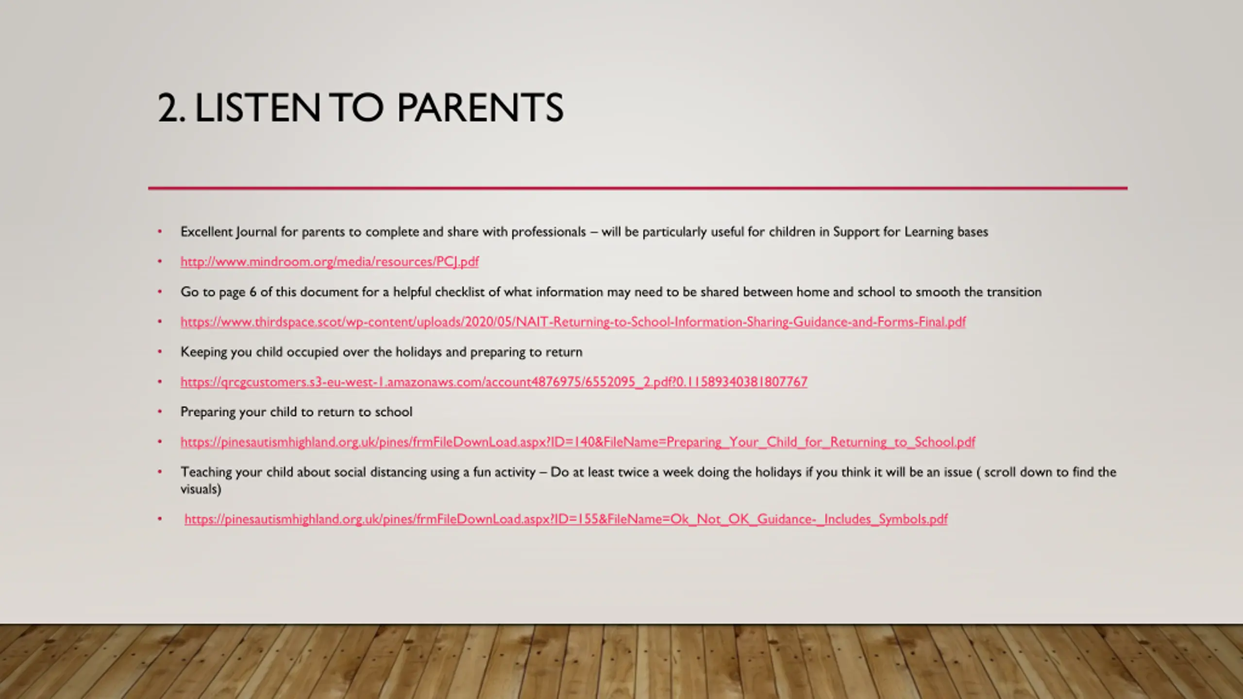 2. LISTEN TO PARENTS Excellent Journal for parents to complete and share with professionals will be particularly useful for children in Support for Learning bases http://www.mindroom.org/media/resources/PCJ.pdf Go to page 6 of this document for a helpful checklist of what information may need to be shared between home and school to smooth the transition https://www.thirdspace.scot/wp-content/uploads/2020/05/NAIT-Returning-to-School-Information-Sharing-Guidance-and-Forms-Final.pdf Keeping you child occupied over the holidays and preparing to return https://qrcgcustomers.s3-eu-west-1.amazonaws.com/account4876975/6552095_2.pdf?0.11589340381807767 Preparing your child to return to school https://pinesautismhighland.org.uk/pines/frmFileDownLoad.aspx?ID=140&FileName=Preparing_Your_Child_for_Returning_to_School.pdf Teaching your child about social distancing using a fun activity Do at least twice a week doing the holidays if you think it will be an issue ( scroll down to find the visuals) https://pinesautismhighland.org.uk/pines/frmFileDownLoad.aspx?ID=155&FileName=Ok_Not_OK_Guidance-_Includes_Symbols.pdf