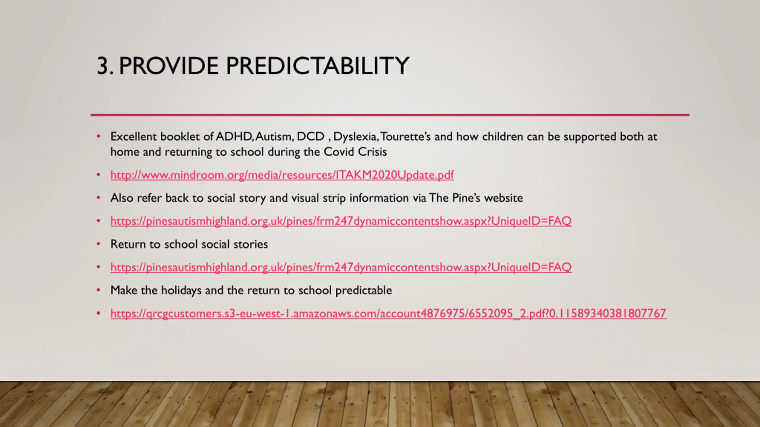 3. PROVIDE PREDICTABILITY Excellent booklet of ADHD, Autism, DCD , Dyslexia, Tourette s and how children can be supported both at home and returning to school during the Covid Crisis http://www.mindroom.org/media/resources/ITAKM2020Update.pdf Also refer back to social story and visual strip information via The Pine s website https://pinesautismhighland.org.uk/pines/frm247dynamiccontentshow.aspx?UniqueID=FAQ Return to school social stories https://pinesautismhighland.org.uk/pines/frm247dynamiccontentshow.aspx?UniqueID=FAQ Make the holidays and the return to school predictable https://qrcgcustomers.s3-eu-west-1.amazonaws.com/account4876975/6552095_2.pdf?0.11589340381807767