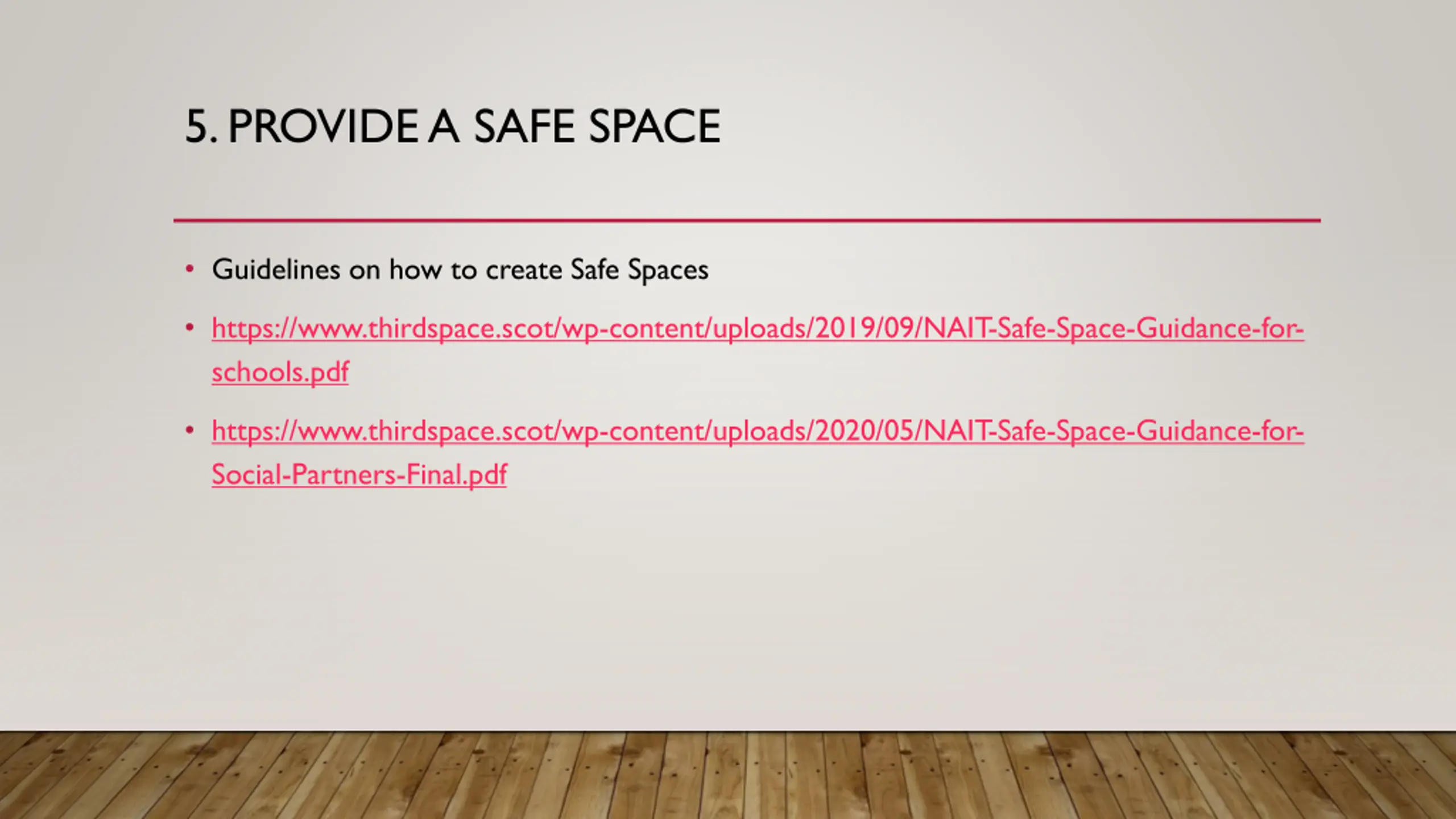 5. PROVIDE A SAFE SPACE Guidelines on how to create Safe Spaces https://www.thirdspace.scot/wp-content/uploads/2019/09/NAIT-Safe-Space-Guidance-for- schools.pdf https://www.thirdspace.scot/wp-content/uploads/2020/05/NAIT-Safe-Space-Guidance-for- Social-Partners-Final.pdf