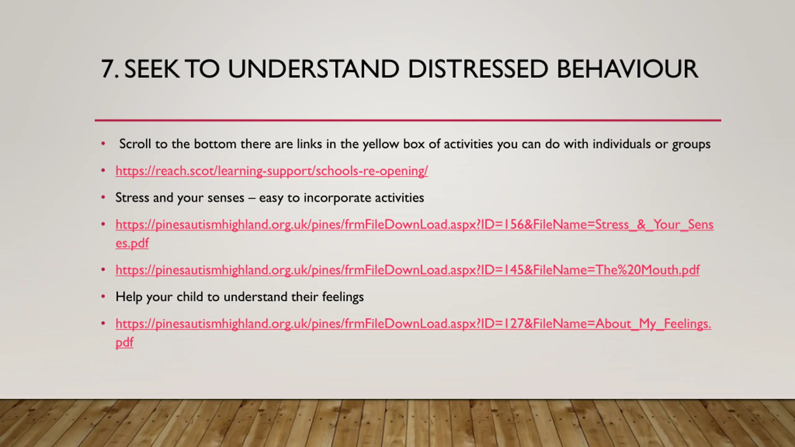 7. SEEK TO UNDERSTAND DISTRESSED BEHAVIOUR Scroll to the bottom there are links in the yellow box of activities you can do with individuals or groups https://reach.scot/learning-support/schools-re-opening/ Stress and your senses easy to incorporate activities https://pinesautismhighland.org.uk/pines/frmFileDownLoad.aspx?ID=156&FileName=Stress_&_Your_Sens es.pdf https://pinesautismhighland.org.uk/pines/frmFileDownLoad.aspx?ID=145&FileName=The%20Mouth.pdf Help your child to understand their feelings https://pinesautismhighland.org.uk/pines/frmFileDownLoad.aspx?ID=127&FileName=About_My_Feelings. pdf