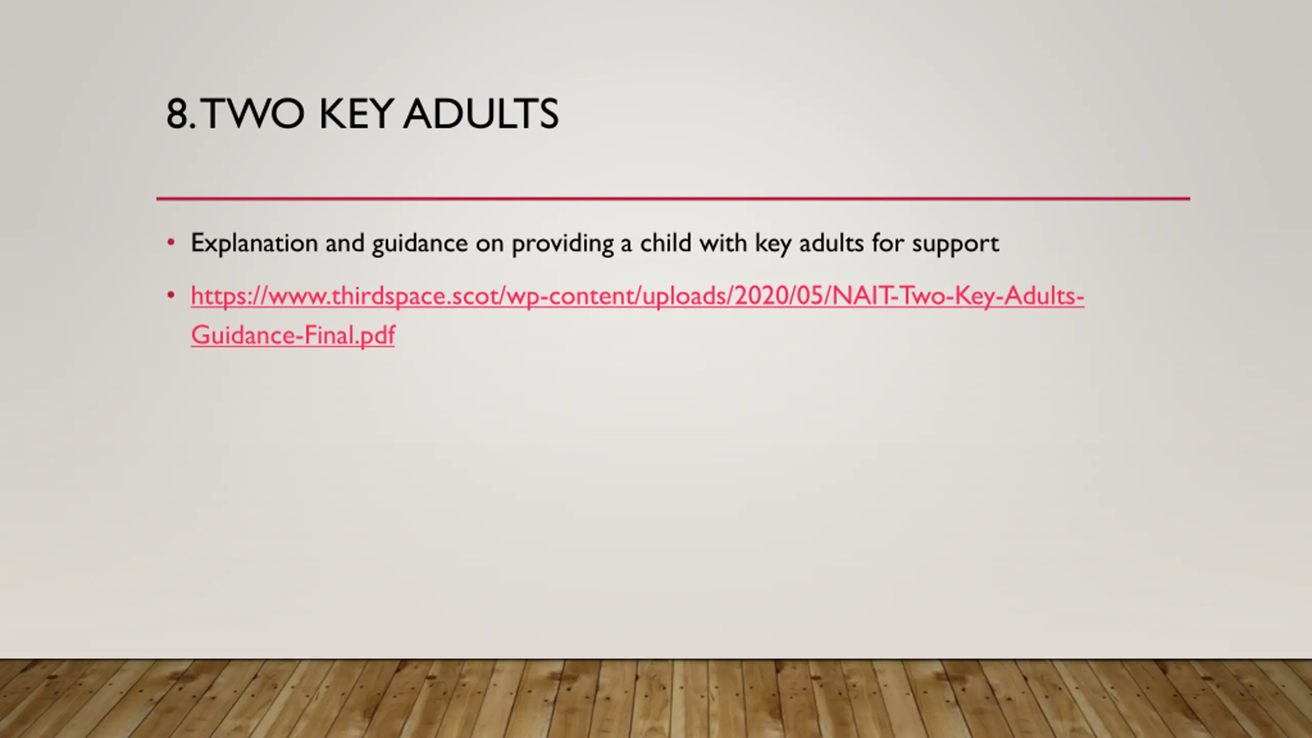 8. TWO KEY ADULTS Explanation and guidance on providing a child with key adults for support https://www.thirdspace.scot/wp-content/uploads/2020/05/NAIT-Two-Key-Adults- Guidance-Final.pdf