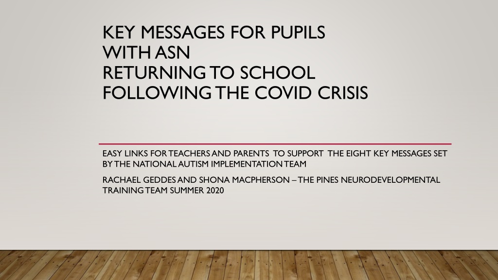 KEY MESSAGES FOR PUPILS WITH ASN RETURNING TO SCHOOL FOLLOWING THE COVID CRISIS EASY LINKS FOR TEACHERS AND PARENTS TO SUPPORT THE EIGHT KEY MESSAGES SET BY THE NATIONAL AUTISM IMPLEMENTATION TEAM RACHAEL GEDDES AND SHONA MACPHERSON THE PINES NEURODEVELOPMENTAL TRAINING TEAM SUMMER 2020