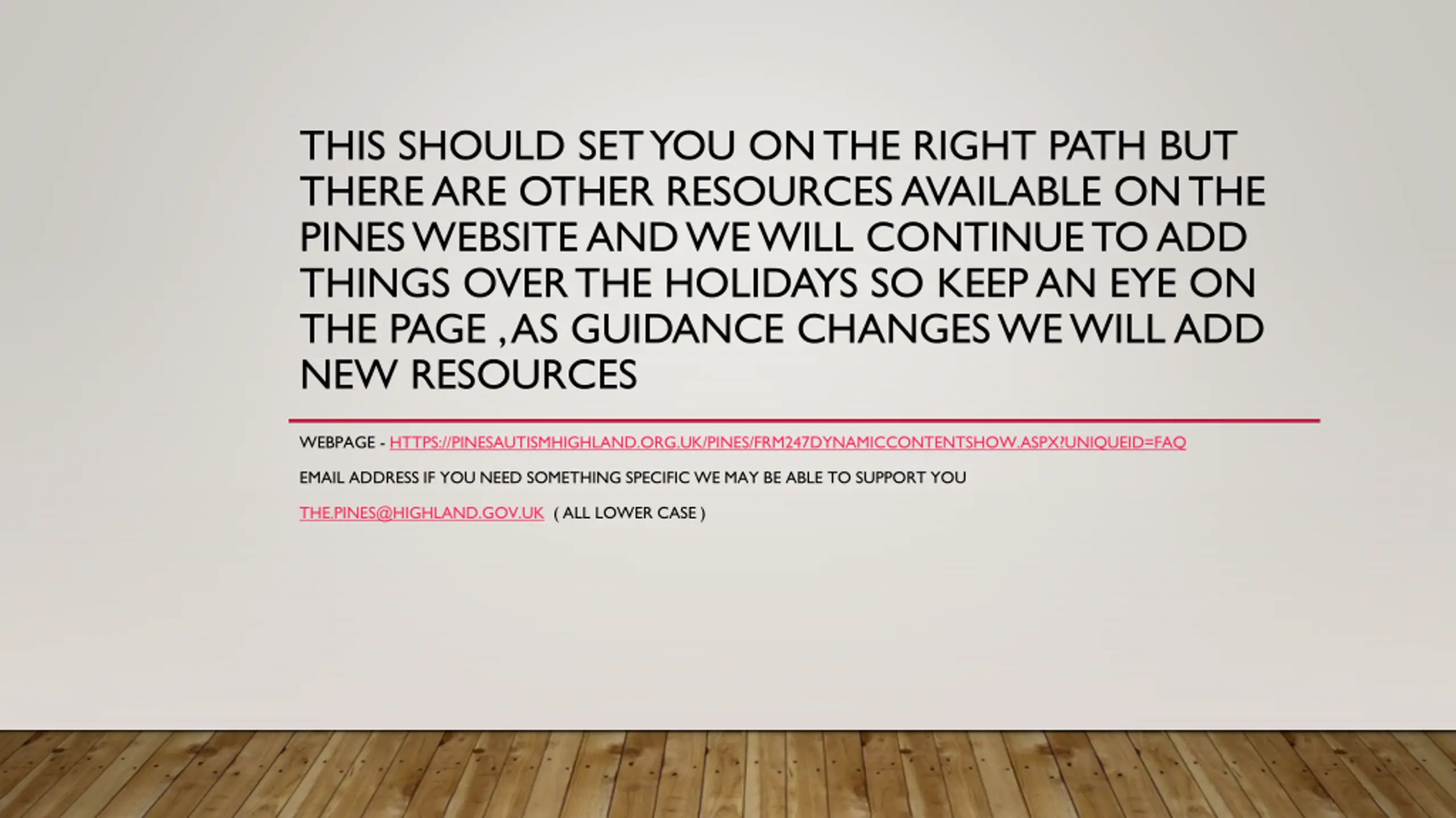 THIS SHOULD SET YOU ON THE RIGHT PATH BUT THERE ARE OTHER RESOURCES AVAILABLE ON THE PINES WEBSITE AND WE WILL CONTINUE TO ADD THINGS OVER THE HOLIDAYS SO KEEP AN EYE ON THE PAGE , AS GUIDANCE CHANGES WE WILL ADD NEW RESOURCES WEBPAGE - HTTPS://PINESAUTISMHIGHLAND.ORG.UK/PINES/FRM247DYNAMICCONTENTSHOW.ASPX?UNIQUEID=FAQ EMAIL ADDRESS IF YOU NEED SOMETHING SPECIFIC WE MAY BE ABLE TO SUPPORT YOU THE.PINES@HIGHLAND.GOV.UK ( ALL LOWER CASE )